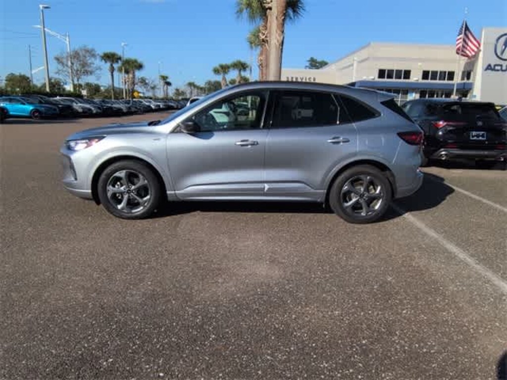 This 2024 Ford Escape ST-Line in Silver Metallic, features Equipment Group 300A, 3.81 Axle Ratio, 4-Wheel Disc Brakes, 6 Speakers, ABS brakes, Air Conditioning, Alloy wheels, AM/FM radio: SiriusXM, AM/FM Stereo, Auto High-beam Headlights, Automatic temperature control, Brake assist, Bumpers: body-color, Compass, Delay-off headlights, Driver door bin, Driver vanity mirror, Dual front impact airbags, Dual front side impact airbags, Electronic Stability Control, Emergency communication system: SYNC 4 911 Assist, Exterior Parking Camera Rear, FordPass Connect, Four wheel independent suspension, Front anti-roll bar, Front Bucket Seats, Front Center Armrest, Front dual zone A/C, Front reading lights, Fully automatic headlights, Illuminated entry, Knee airbag, Low tire pressure warning, Occupant sensing airbag, Outside temperature display, Overhead airbag, Overhead console, Panic alarm, Passenger door bin, Passenger vanity mirror, Power door mirrors, Power driver seat, Power Liftgate, Power steering, Power windows, Radio data system, Rear anti-roll bar, Rear reading lights, Rear seat center armrest, Rear window defroster, Rear window wiper, Remote keyless entry, Roof rack: rails only, Speed control, Speed-sensing steering, Speed-Sensitive Wipers, Split folding rear seat, Spoiler, Sport steering wheel, Steering wheel mounted audio controls, SYNC 4, Tachometer, Telescoping steering wheel, Tilt steering wheel, Traction control, Trip computer, Variably intermittent wipers, Vinyl/Cloth Front Sport Contour Bucket Seats, and Wheels: 18 Rock Metallic Painted Aluminum:
