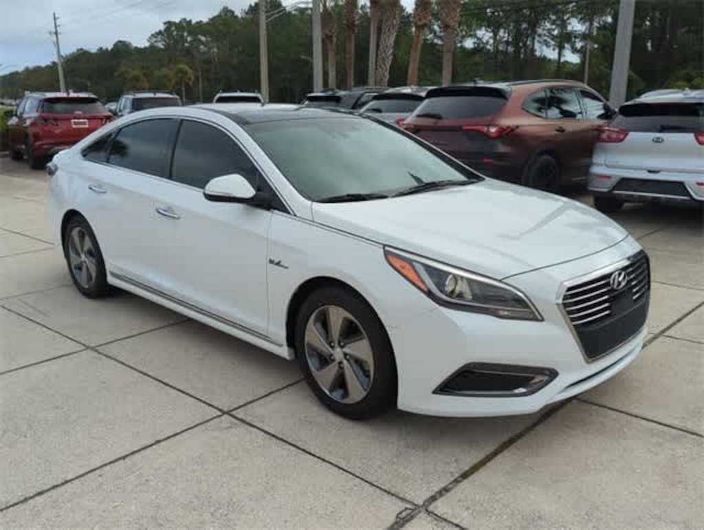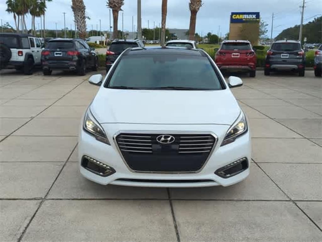 This 2017 Hyundai Sonata Hybrid Limited in Hyper White, features Ultimate Package 02 (Automatic High Beam Assist, Forward Collision Warning, High-Gloss Window Surrounds, Lane Departure Warning System, LED Interior Lights, Option Group 02, Panoramic Sunroof, Radio: AM/FM/SiriusXM/CD/MP3 w/Navigation, Rear Parking Sensors, and Smart Cruise Control w/Stop/Start), 17 Alloy Wheels, 4-Wheel Disc Brakes, 6 Speakers, ABS brakes, Air Conditioning, Alloy wheels, AM/FM radio: SiriusXM, Apple CarPlay & Android Auto, Auto-dimming Rear-View mirror, Automatic temperature control, Brake assist, Bumpers: body-color, Cargo Net, Carpeted Floor Mats, CD player, Compass, Delay-off headlights, Driver door bin, Driver vanity mirror, Dual front impact airbags, Dual front side impact airbags, Electronic Stability Control, Emergency communication system: Blue Link, Exterior Parking Camera Rear, First Aid Kit, Four wheel independent suspension, Front anti-roll bar, Front Bucket Seats, Front Center Armrest w/Storage, Front dual zone A/C, Front reading lights, Fully automatic headlights, Garage door transmitter: HomeLink, Heated & Ventilated Front Bucket Seats, Heated door mirrors, Heated front seats, High intensity discharge headlights: Xenon, Illuminated entry, Knee airbag, Leather Seating Surfaces, Leather Shift Knob, Leather steering wheel, Low tire pressure warning, Memory seat, Occupant sensing airbag, Outside temperature display, Overhead airbag, Overhead console, Panic alarm, Passenger door bin, Passenger vanity mirror, Power door mirrors, Power driver seat, Power passenger seat, Power steering, Power windows, Radio: AM/FM/SiriusXM/CD/MP3 Display Audio, Rear anti-roll bar, Rear Bumper Applique, Rear seat center armrest, Rear window defroster, Remote keyless entry, Security system, Speed control, Speed-sensing steering, Speed-Sensitive Wipers, Split folding rear seat, Spoiler, Steering wheel mounted audio controls, Telescoping steering wheel, Tilt steering wheel, Traction control, Trip computer, Turn signal indicator mirrors, Variably intermittent wipers, and Ventilated front seats: