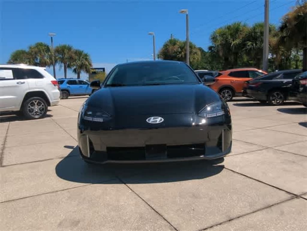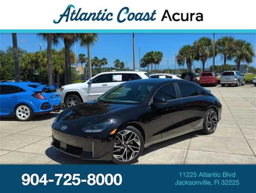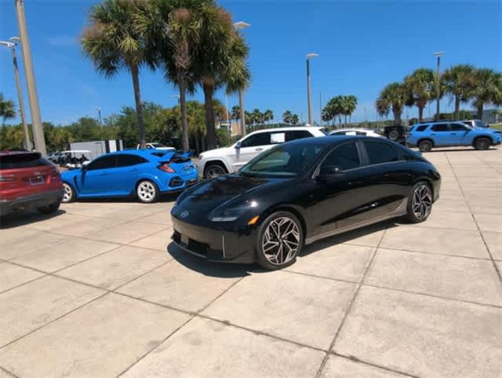 This 2023 Hyundai IONIQ 6 SEL in Onyx Black, features Cargo Package (Cargo Blocks and Rear Reversible Cargo Tray), Option Group 01, 4-Wheel Disc Brakes, 6 Speakers, ABS brakes, Air Conditioning, Alloy wheels, AM/FM radio: SiriusXM, Apple CarPlay & Android Auto, Auto High-beam Headlights, Auto-dimming Rear-View mirror, Automatic temperature control, Brake assist, Bumpers: body-color, Carpeted Floor Mats, Delay-off headlights, Driver door bin, Driver vanity mirror, Dual front impact airbags, Dual front side impact airbags, Electronic Stability Control, Emergency communication system: Blue Link Connected Car Service (3-year complimentary subscription), Envelope Cargo Net, First Aid Kit, Four wheel independent suspension, Front anti-roll bar, Front Bucket Seats, Front Center Armrest, Front dual zone A/C, Front reading lights, Fully automatic headlights, Garage door transmitter: HomeLink, H-Tex Leatherette Seating Surfaces, harman/kardonî Speakers, Heated door mirrors, Heated Front Bucket Seats, Heated front seats, Illuminated entry, Leather steering wheel, Low tire pressure warning, Navigation System, Occupant sensing airbag, Outside temperature display, Overhead airbag, Panic alarm, Passenger door bin, Passenger vanity mirror, Power door mirrors, Power driver seat, Power steering, Power windows, Radio: AM/FM/SiriusXM/HD Radio Audio System, Rear anti-roll bar, Rear reading lights, Rear seat center armrest, Rear window defroster, Remote keyless entry, Security system, Speed control, Speed-sensing steering, Split folding rear seat, Spoiler, Steering wheel mounted audio controls, Telescoping steering wheel, Tilt steering wheel, Traction control, Trip computer, Turn signal indicator mirrors, Variably intermittent wipers, Wheel Locks, and Wheels: 20 x 8.5J Alloy: