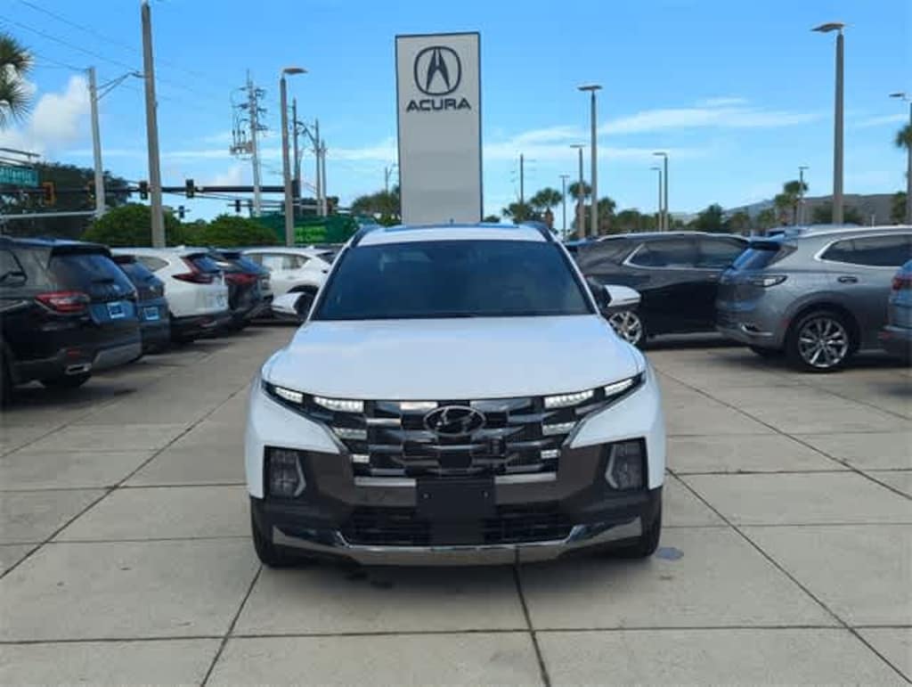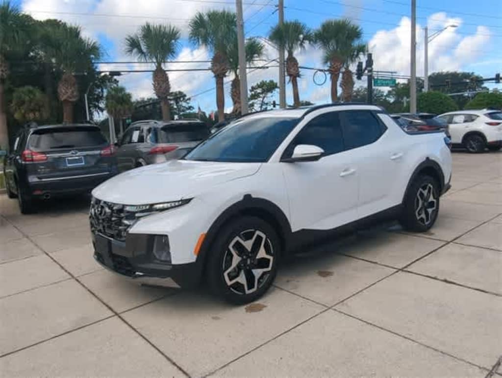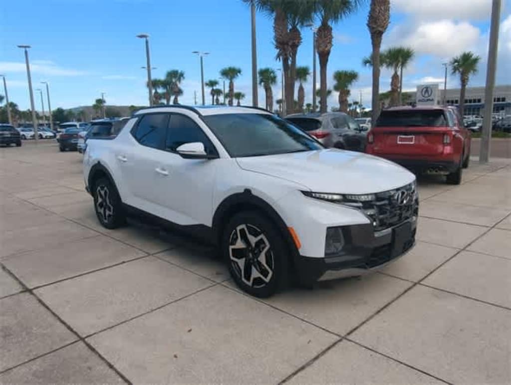 This 2024 Hyundai Santa Cruz Limited in Atlas White, features Option Group 01, 3.316 Axle Ratio, 4-Wheel Disc Brakes, 8 Speakers, ABS brakes, Air Conditioning, Alloy wheels, AM/FM radio: SiriusXM, Apple CarPlay & Android Auto, Auto High-beam Headlights, Auto-dimming Rear-View mirror, Auto-leveling suspension, Automatic temperature control, Brake assist, Bumpers: body-color, Carpeted Floor Mats, Delay-off headlights, Driver door bin, Driver vanity mirror, Dual front impact airbags, Dual front side impact airbags, Electronic Stability Control, Emergency communication system: Bluelink+, Exterior Parking Camera Rear, First Aid Kit, Four wheel independent suspension, Front anti-roll bar, Front Bucket Seats, Front Center Armrest, Front dual zone A/C, Front reading lights, Fully automatic headlights, Garage door transmitter: HomeLink, Heated & Ventilated Front Bucket Seats, Heated door mirrors, Heated front seats, Heated steering wheel, Illuminated entry, Leather Shift Knob, Leather steering wheel, Leather-Trimmed Seats, Low tire pressure warning, Navigation System, Occupant sensing airbag, Outside temperature display, Overhead airbag, Overhead console, Panic alarm, Passenger door bin, Passenger vanity mirror, Power door mirrors, Power driver seat, Power moonroof, Power steering, Power windows, Radio data system, Radio: AM/FM/HD w/Bose Premium Audio System, Rain sensing wipers, Rear anti-roll bar, Rear side impact airbag, Rear step bumper, Rear window defroster, Remote keyless entry, Security system, Side Steps, Speed control, Speed-sensing steering, Split folding rear seat, Spoiler, Steering wheel mounted audio controls, Tachometer, Telescoping steering wheel, Tilt steering wheel, Traction control, Trip computer, Turn signal indicator mirrors, Variably intermittent wipers, Ventilated front seats, and Wheels: 20 x 7.5J Alloy: