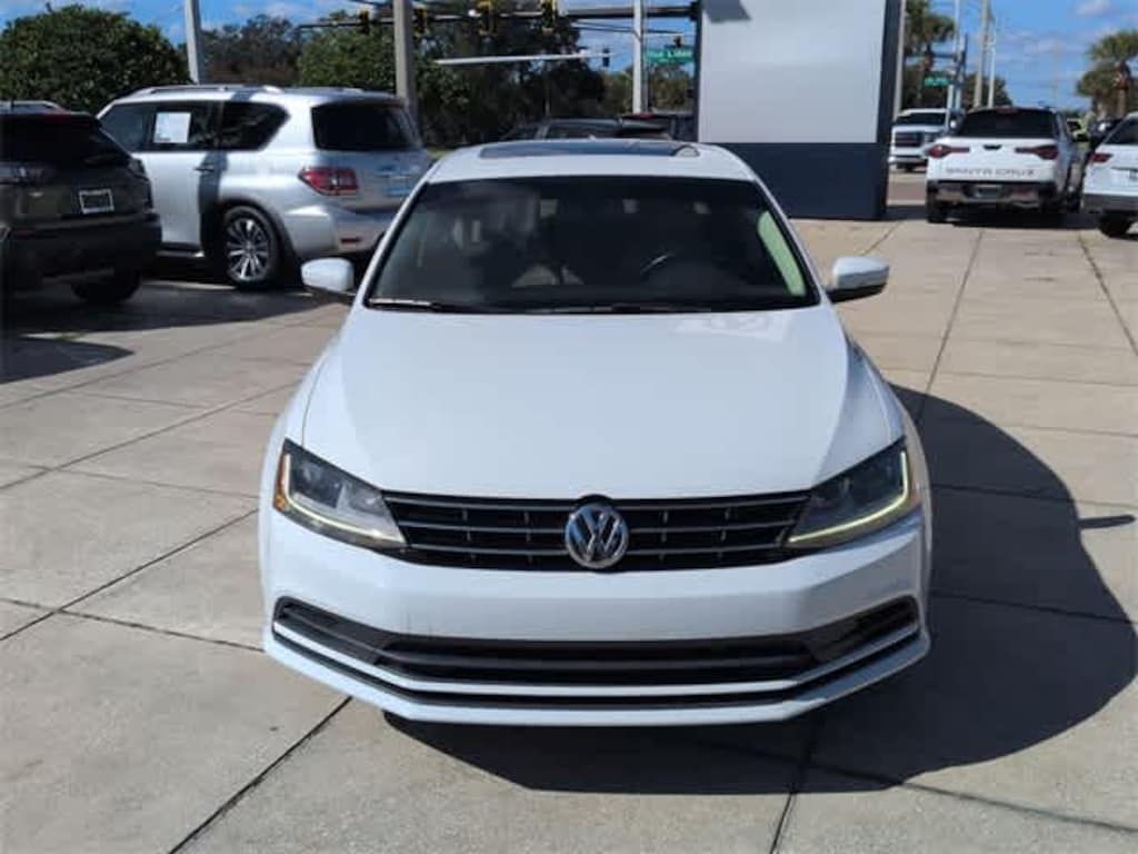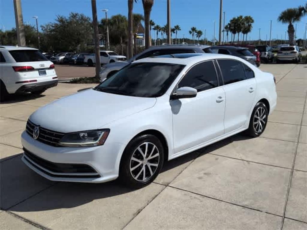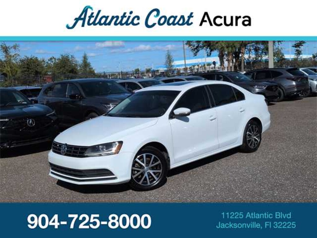 This 2018 Volkswagen Jetta 1.4T SE in Pure White, features 4 Speakers, 4-Wheel Disc Brakes, ABS brakes, Air Conditioning, Alloy wheels, AM/FM radio: SiriusXM, Brake assist, Bumpers: body-color, CD player, Chrome Exhaust Tips, Driver door bin, Driver vanity mirror, Dual front impact airbags, Dual front side impact airbags, Electronic Stability Control, Emergency communication system: VW Car-Net, Exterior Parking Camera Rear, Four wheel independent suspension, Front anti-roll bar, Front Bucket Seats, Front Center Armrest, Front reading lights, Heated door mirrors, Heated Front Comfort Seats, Heated front seats, Heavy Duty Trunk Liner w/VW CarGo Blocks, Illuminated entry, Leather Shift Knob, Low tire pressure warning, Monster Mats w/Logo Rubber Mat Kit (Set of 4), Occupant sensing airbag, Outside temperature display, Overhead airbag, Overhead console, Panic alarm, Passenger door bin, Passenger vanity mirror, Power door mirrors, Power moonroof, Power steering, Power windows, Radio data system, Radio: Composition Media w/6.3 Touchscreen, Rear anti-roll bar, Rear reading lights, Rear seat center armrest, Rear window defroster, Remote keyless entry, Roadside Assistance Kit, Speed control, Speed-sensing steering, Split folding rear seat, Steering wheel mounted audio controls, Tachometer, Telescoping steering wheel, Tilt steering wheel, Traction control, Trip computer, Turn signal indicator mirrors, V-Tex Leatherette Seat Trim, Variably intermittent wipers, and Wheels: 16 Sedona Black Alloy: