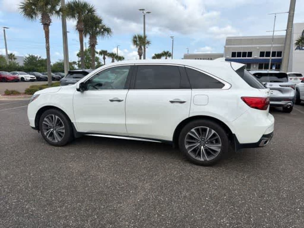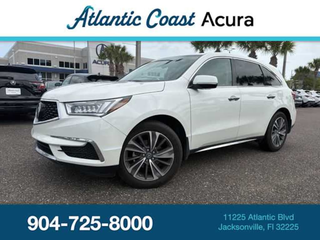 This 2019 Acura MDX 3.5L Technology Package in White Diamond Pearl, features 10 Speakers, 3rd row seats: bench, 4-Wheel Disc Brakes, 4.33 Axle Ratio, ABS brakes, Adaptive suspension, Air Conditioning, Alloy wheels, AM/FM radio: SiriusXM, Anti-whiplash front head restraints, Apple CarPlay/Android Auto, Audio memory, Auto High-beam Headlights, Auto tilt-away steering wheel, Auto-dimming Rear-View mirror, Automatic temperature control, Brake assist, Bumpers: body-color, CD player, Compass, Delay-off headlights, Driver door bin, Driver vanity mirror, Dual front impact airbags, Dual front side impact airbags, Electronic Stability Control, Emergency communication system, Exterior Parking Camera Rear, Four wheel independent suspension, Front anti-roll bar, Front Bucket Seats, Front Center Armrest, Front dual zone A/C, Front reading lights, Garage door transmitter: HomeLink, Genuine wood console insert, Genuine wood dashboard insert, Genuine wood door panel insert, Heated door mirrors, Heated front seats, Heated Front Sport Seats, HVAC memory, Illuminated entry, Knee airbag, Lane departure: Lane Keeping Assist System (LKAS) active, Leather steering wheel, Low tire pressure warning, Memory seat, Navigation System, Occupant sensing airbag, Outside temperature display, Overhead airbag, Overhead console, Panic alarm, Passenger door bin, Passenger vanity mirror, Perforated Premium Leather w/Contrast Stitching, Power door mirrors, Power driver seat, Power Liftgate, Power moonroof, Power passenger seat, Power steering, Power windows, Premium audio system: Acura/ELS Surround, Radio data system, Radio: Acura/ELS Studio Premium Audio System, Rain sensing wipers, Rear air conditioning, Rear anti-roll bar, Rear reading lights, Rear seat center armrest, Rear window defroster, Rear window wiper, Remote keyless entry, Security system, Speed control, Speed-sensing steering, Speed-Sensitive Wipers, Split folding rear seat, Spoiler, Steering wheel memory, Steering wheel mounted audio controls, Tachometer, Telescoping steering wheel, Tilt steering wheel, Traction control, Trip computer, Turn signal indicator mirrors, Variably intermittent wipers, and Wheels: 20 x 8 Shark Gray Twisted 10-Spoke: