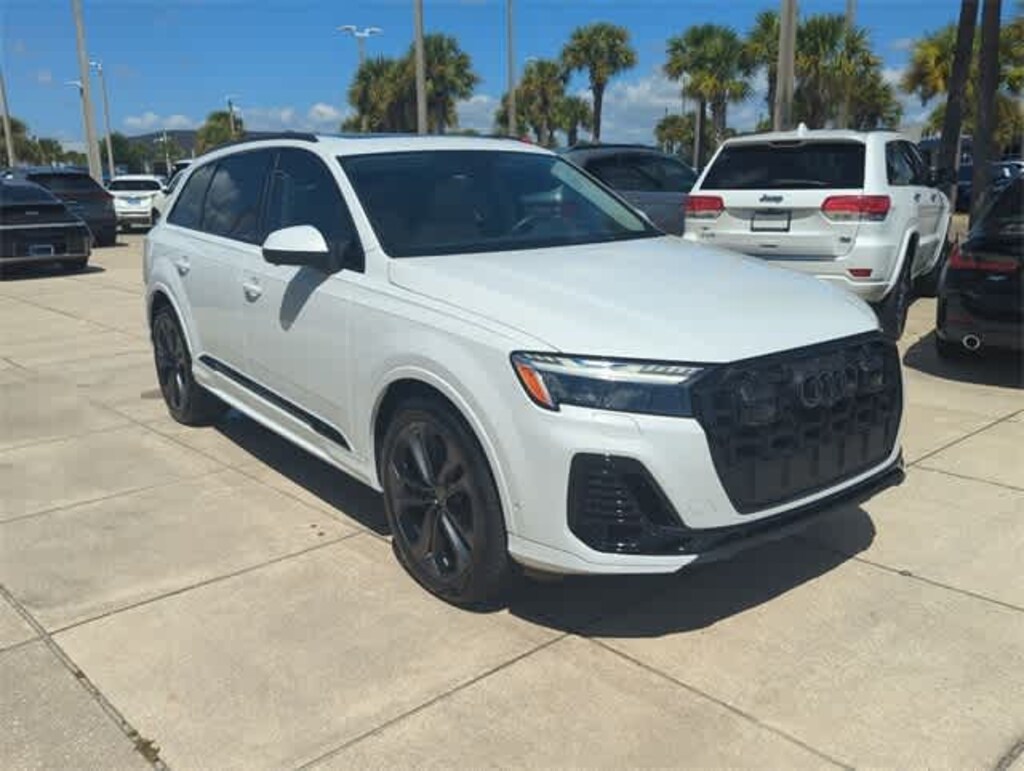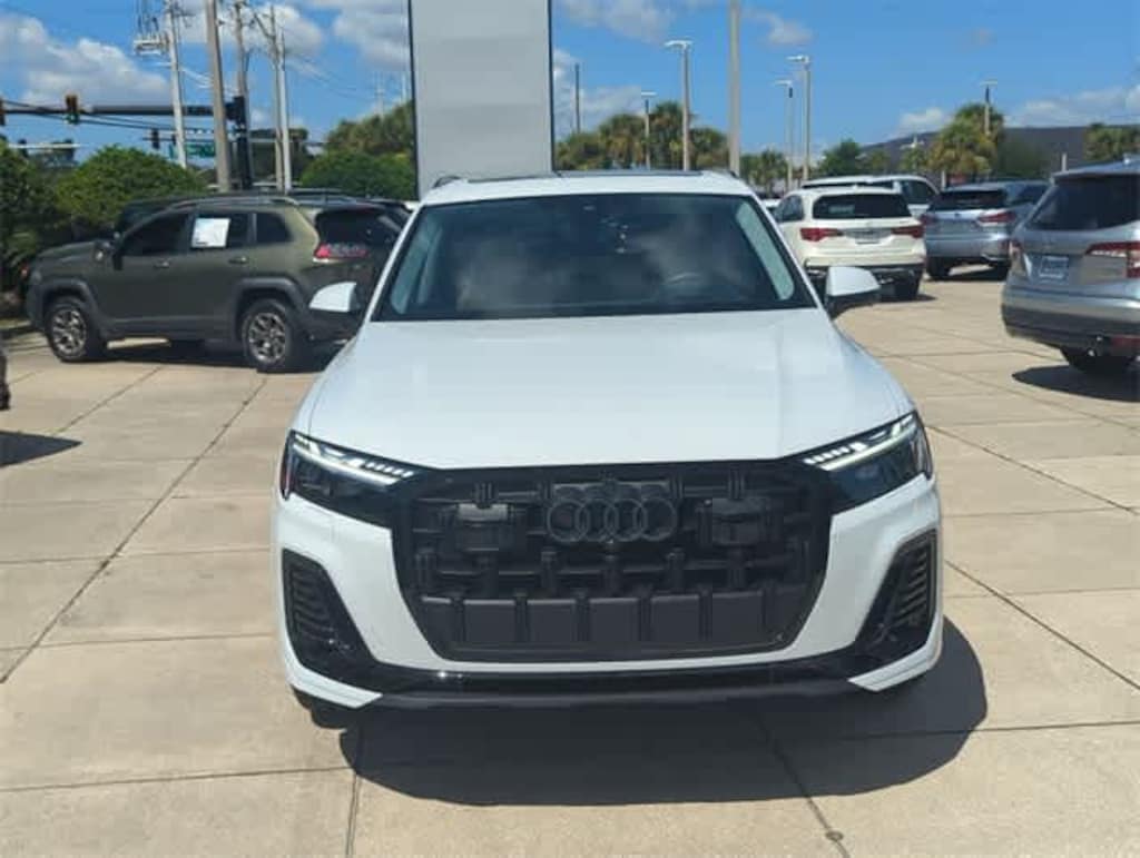 This 2025 Audi Q7 55 Prestige in White, features 10 Speakers, 3rd row seats: bench, 4-Wheel Disc Brakes, ABS brakes, Air Conditioning, Alloy wheels, AM/FM radio: SiriusXM w/ 360L, Auto High-beam Headlights, Auto-dimming door mirrors, Auto-dimming Rear-View mirror, Automatic temperature control, Brake assist, Bumpers: body-color, Compass, Delay-off headlights, Driver door bin, Driver vanity mirror, Dual front impact airbags, Dual front side impact airbags, Electronic Stability Control, Emergency communication system: Audi connect CARE, Exterior Parking Camera Rear, Four wheel independent suspension, Front anti-roll bar, Front Bucket Seats, Front Center Armrest, Front dual zone A/C, Front fog lights, Front reading lights, Fully automatic headlights, Garage door transmitter: HomeLink, Genuine wood door panel insert, Heated door mirrors, Heated Front Bucket Seats, Heated front seats, Illuminated entry, Leather Seating Surfaces, Leather Shift Knob, Leather steering wheel, Low tire pressure warning, Memory seat, Navigation system: Audi MMI Navigation plus with Touch Response, Occupant sensing airbag, Outside temperature display, Overhead airbag, Overhead console, Panic alarm, Passenger door bin, Passenger vanity mirror, Power door mirrors, Power driver seat, Power Liftgate, Power moonroof: Panoramic, Power passenger seat, Power steering, Power windows, Radio data system, Radio: Audi Sound System, Rain sensing wipers, Rear air conditioning, Rear anti-roll bar, Rear fog lights, Rear reading lights, Rear seat center armrest, Rear side impact airbag, Rear window defroster, Rear window wiper, Reclining 3rd row seat, Remote keyless entry, Security system, Speed control, Speed-sensing steering, Split folding rear seat, Spoiler, Steering wheel memory, Steering wheel mounted audio controls, Tachometer, Telescoping steering wheel, Tilt steering wheel, Traction control, Trip computer, Turn signal indicator mirrors, Variably intermittent wipers, and Wheels: 19 5-Arm-Star Design:
