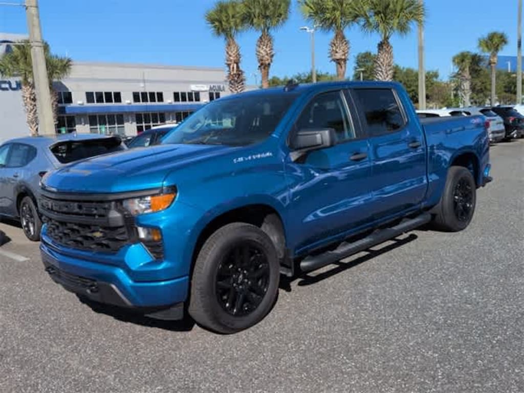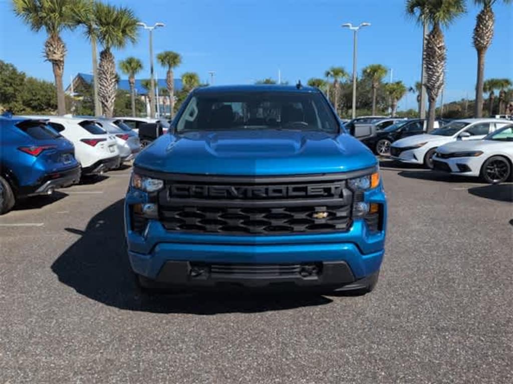 This 2024 Chevrolet Silverado 1500 Custom in Glacier Blue Metallic, features Custom Convenience Package (Electric Rear-Window Defogger, EZ Lift Power Lock & Release Tailgate, LED Cargo Area Lighting, Remote Vehicle Starter System, and Theft Deterrent System (Unauthorized Entry)), Custom Value Package, High Capacity Suspension Package, Preferred Equipment Group 1CX (10-Way Power Driver Seat w/Lumbar, 120-Volt Bed Mounted Power Outlet, 120-Volt Interior Power Outlet, 3.5 Monochromatic Display Driver Info Center, Bluetoothî For Phone, Chevrolet Connected Access Capable, Color-Keyed Carpeting Floor Covering, Deep-Tinted Glass, Dual Rear USB Ports (Charge Only), Electrical Steering Column Lock, Electronic Cruise Control, Front Frame-Mounted Black Recovery Hooks, Front Rubberized Vinyl Floor Mats, HD Rear Vision Camera, Manual Tilt Wheel Steering Column, OnStar & Chevrolet Connected Services Capable, Power Front Windows w/Driver Express Up/Down, Power Front Windows w/Passenger Express Down, Power Rear Windows w/Express Down, Rear 60/40 Folding Bench Seat (Folds Up), Rear Rubberized-Vinyl Floor Mats, Remote Keyless Entry, SiriusXM Radio, Standard Tailgate, and Wi-Fi Hot Spot Capable), Trailering Package (Hitch Guidance), 3.42 Rear Axle Ratio, 4-Wheel Disc Brakes, 40/20/40 Front Split-Bench Seat, 6 Speakers, 6-Speaker Audio System, ABS brakes, Air Conditioning, Alloy wheels, AM/FM radio: SiriusXM, Auto High-beam Headlights, Automatic Emergency Braking, Brake assist, Bumpers: body-color, Cloth Seat Trim, Compass, Delay-off headlights, Driver door bin, Driver vanity mirror, Dual front impact airbags, Dual front side impact airbags, Electronic Stability Control, Following Distance Indicator, Forward Collision Alert, Front anti-roll bar, Front Center Armrest w/Storage, Front Pedestrian Braking, Front reading lights, Front wheel independent suspension, Fully automatic headlights, Heated door mirrors, Illuminated entry, IntelliBeam Automatic High Beam On/Off, Lane Keep Assist w/Lane Departure Warning, Low tire pressure warning, Occupant sensing airbag, Outside temperature display, Overhead airbag, Overhead console, Panic alarm, Passenger door bin, Passenger vanity mirror, Power door mirrors, Power driver seat, Power steering, Power windows, Premium audio system: Chevrolet Infotainment 3, Radio data system, Radio: Chevrolet Infotainment 3 System, Rear reading lights, Rear step bumper, Rear window defroster, Remote keyless entry, Security system, Single Outlet Exhaust, Speed control, Speed-sensing steering, Split folding rear seat, Tachometer, Tilt steering wheel, Traction control, Trip computer, Variably intermittent wipers, Voltmeter, Wheels: 20 x 9 Bright Silver Painted Aluminum, and Wheels: 20 x 9 High Gloss Black Painted Alum: