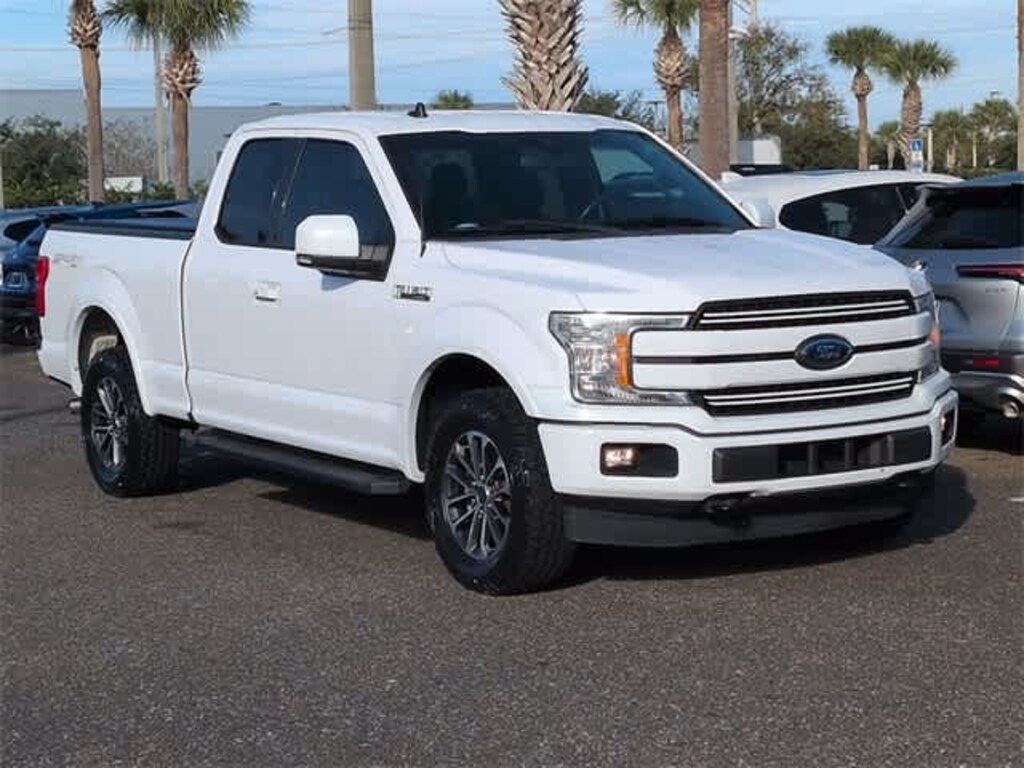 This 2019 Ford F-150 Lariat in White Platinum Metallic Tri-Coat, features ABS brakes, Alloy wheels, Compass, Electronic Stability Control, Front dual zone A/C, Heated door mirrors, Heated front seats, Illuminated entry, Low tire pressure warning, Remote keyless entry, Traction control, 18 Machined-Aluminum Wheels, 4-Wheel Disc Brakes, 7 Speakers, Adjustable pedals, Air Conditioning, AM/FM radio: SiriusXM, AppLink/Apple CarPlay and Android Auto, Auto High-beam Headlights, Auto-dimming door mirrors, Auto-dimming Rear-View mirror, Automatic temperature control, Brake assist, Bumpers: chrome, Class IV Trailer Hitch Receiver, Delay-off headlights, Driver door bin, Driver vanity mirror, Dual front impact airbags, Dual front side impact airbags, Emergency communication system: SYNC 3 911 Assist, Exterior Parking Camera Rear, Front anti-roll bar, Front Center Armrest w/Storage, Front fog lights, Front reading lights, Front wheel independent suspension, Fully automatic headlights, Leather-Trimmed 40/20/40 Front Seat, Memory seat, Occupant sensing airbag, Outside temperature display, Overhead airbag, Overhead console, Panic alarm, Passenger door bin, Passenger vanity mirror, Pedal memory, Power door mirrors, Power driver seat, Power passenger seat, Power steering, Power windows, Radio data system, Radio: AM/FM Stereo w/6 Speakers, Rear step bumper, Rear window defroster, Security system, SiriusXM Radio, Speed control, Speed-sensing steering, Split folding rear seat, Steering wheel mounted audio controls, SYNC 3, Tachometer, Telescoping steering wheel, Tilt steering wheel, Trip computer, Turn signal indicator mirrors, Variably intermittent wipers, Ventilated front seats, and Voltmeter: