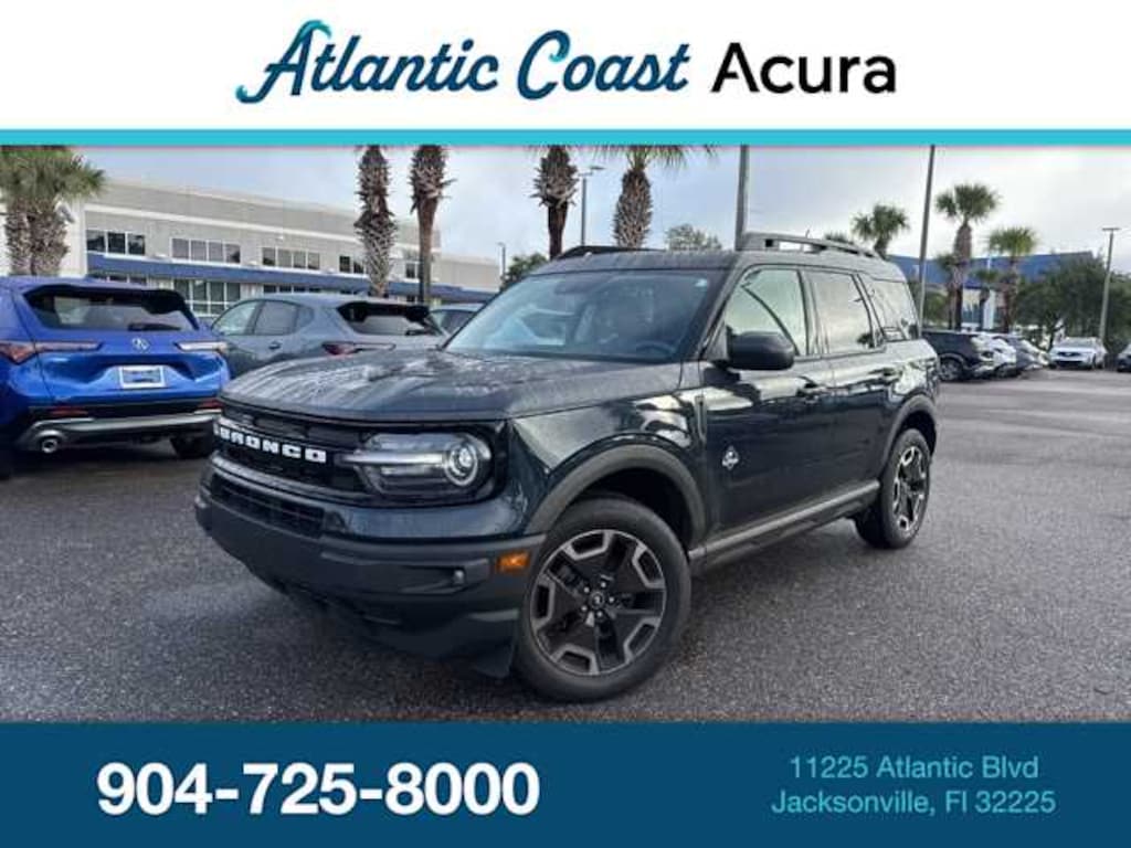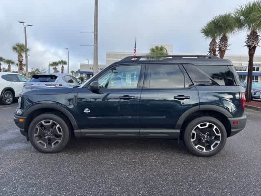 This 2022 Ford Bronco Sport Outer Banks in Alto Blue Metallic Tinted Clearcoat, features Equipment Group 300A, Tech Package (HD Radio, Universal Garage Door Opener (UGDO), and Wireless Charging Pad), 3.80 Axle Ratio, 4-Wheel Disc Brakes, 4G LTE Wi-Fi Hotspot Credit, 6 Speakers, ABS brakes, Air Conditioning, Alloy wheels, AM/FM radio: SiriusXM, AM/FM Stereo, Auto High-beam Headlights, Auto-dimming Rear-View mirror, Automatic temperature control, Brake assist, Cargo Mat, Compass, Delay-off headlights, Driver door bin, Driver vanity mirror, Dual front impact airbags, Dual front side impact airbags, Electronic Stability Control, Emergency communication system: SYNC 3 911 Assist, Four wheel independent suspension, Front anti-roll bar, Front Bucket Seats, Front Center Armrest, Front dual zone A/C, Front fog lights, Front reading lights, Fully automatic headlights, Heated door mirrors, Heated front seats, Heated steering wheel, Illuminated entry, Knee airbag, Leather Trimmed Heated Sport Contour Bucket Seats, Low tire pressure warning, Occupant sensing airbag, Outside temperature display, Overhead airbag, Overhead console, Panic alarm, Passenger door bin, Passenger vanity mirror, Power door mirrors, Power driver seat, Power Moonroof, Power passenger seat, Power steering, Power windows, Radio data system, Rain sensing wipers, Rear anti-roll bar, Rear Parking Sensors, Rear reading lights, Rear seat center armrest, Rear window defroster, Rear window wiper, Remote keyless entry, Roof rack: rails only, Security system, SiriusXM Radio, Speed control, Speed-sensing steering, Speed-Sensitive Wipers, Split folding rear seat, Steering wheel mounted audio controls, SYNC 3 Communications & Entertainment System, SYNC 3/Apple CarPlay/Android Auto, Tachometer, Telescoping steering wheel, Tilt steering wheel, Traction control, Trip computer, Variably intermittent wipers, and Wheels: 18 Ebony Black-Painted Aluminum:
