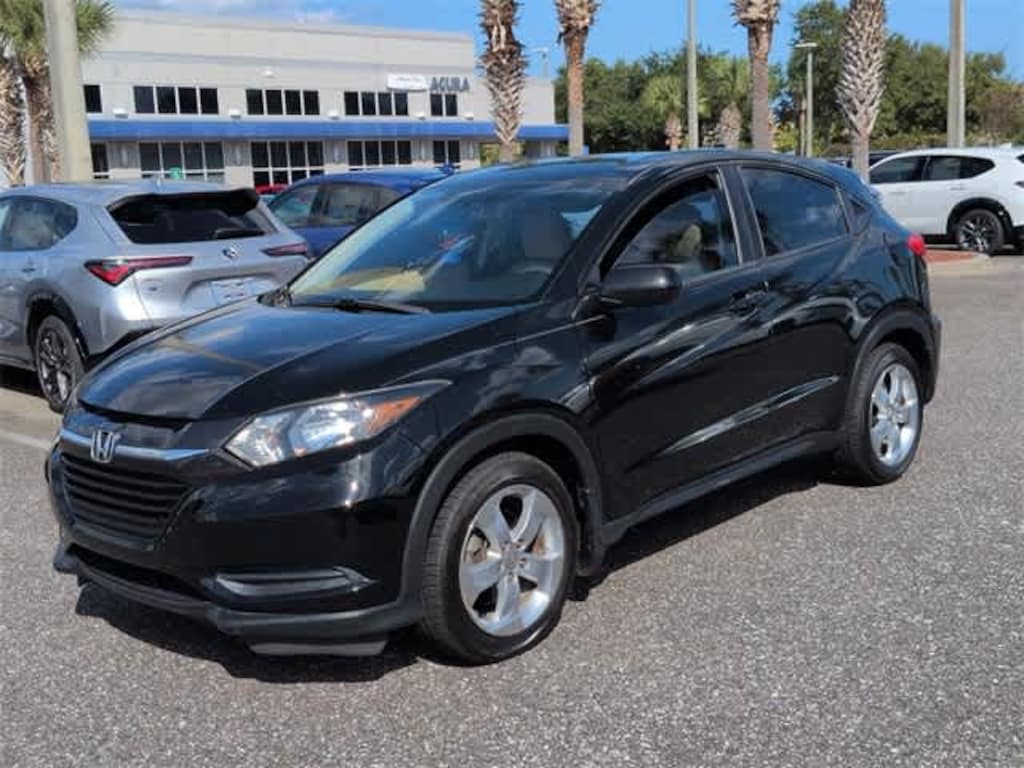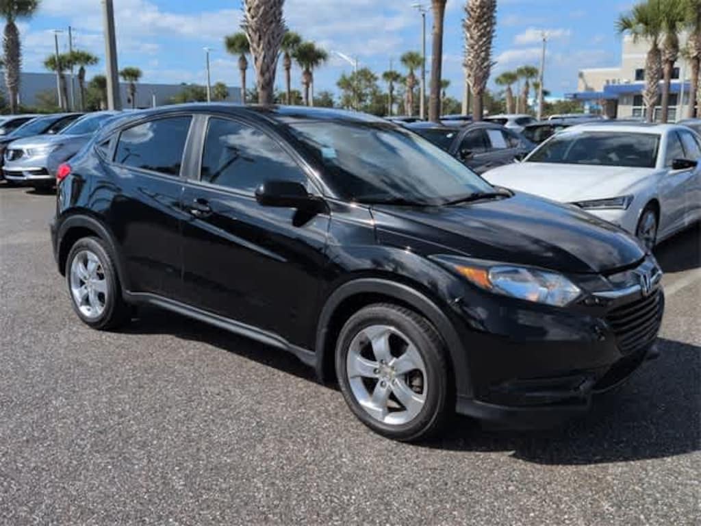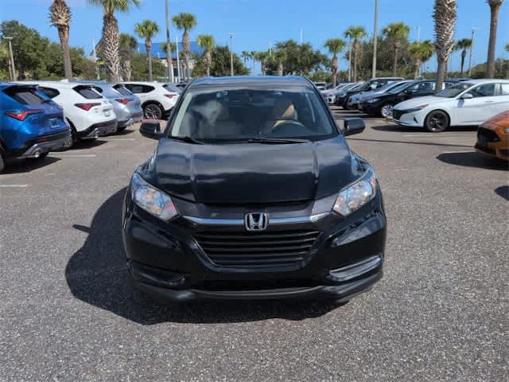 This 2016 Honda HR-V LX in Crystal Black Pearl, features 4 Speakers, 4-Wheel Disc Brakes, 5.436 Axle Ratio, ABS brakes, Air Conditioning, Alloy wheels, AM/FM radio, Brake assist, Bumpers: body-color, CD player, Cloth Seat Trim, Driver door bin, Driver vanity mirror, Dual front impact airbags, Dual front side impact airbags, Electronic Stability Control, Exterior Parking Camera Rear, Front Bucket Seats, Front Center Armrest, Front reading lights, Front wheel independent suspension, Illuminated entry, Low tire pressure warning, Occupant sensing airbag, Outside temperature display, Overhead airbag, Panic alarm, Passenger door bin, Passenger vanity mirror, Power door mirrors, Power steering, Power windows, Radio data system, Radio: AM/FM/CD Audio System (160 Watts), Rear anti-roll bar, Rear window defroster, Rear window wiper, Remote keyless entry, Security system, Speed control, Split folding rear seat, Spoiler, Steering wheel mounted audio controls, Tachometer, Telescoping steering wheel, Tilt steering wheel, Traction control, and Trip computer:
