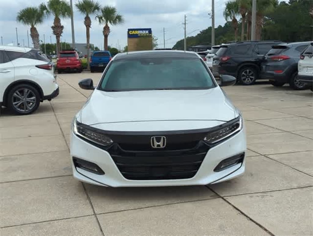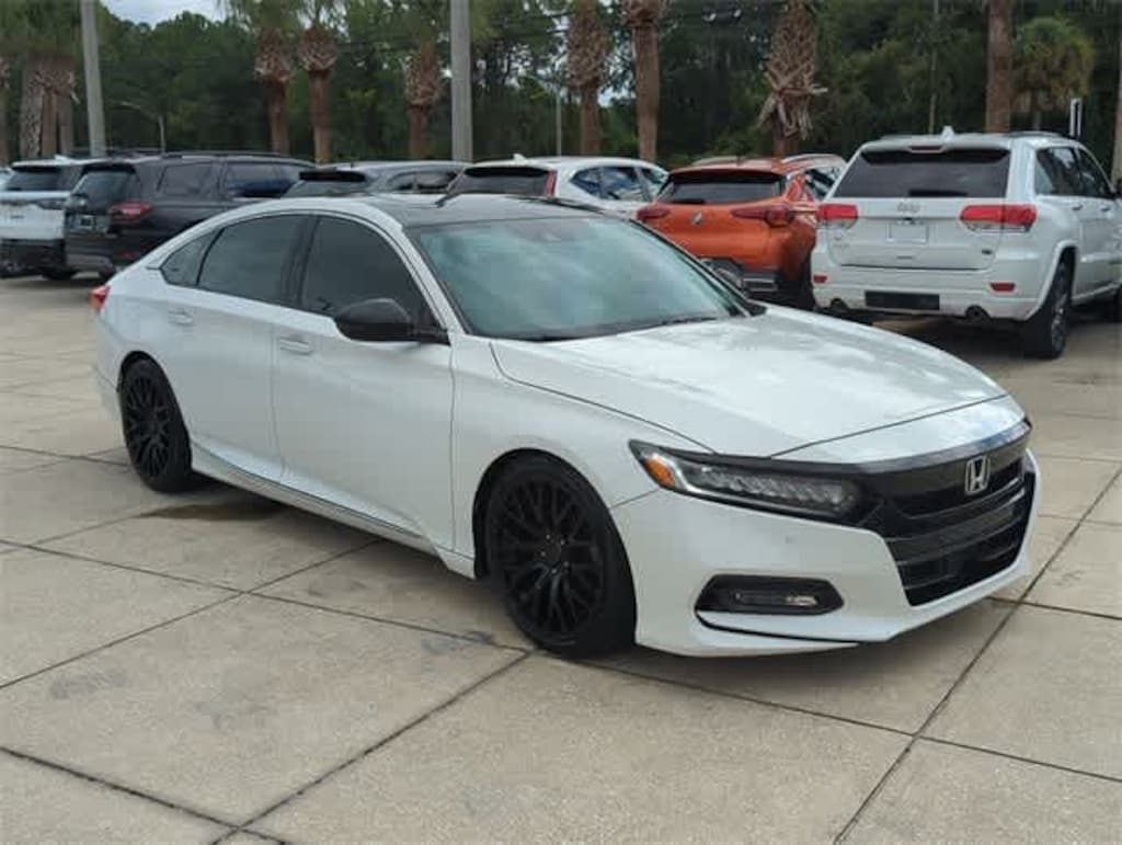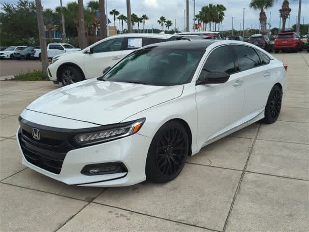This 2018 Honda Accord Touring 2.0T in White, features 10 Speakers, 4-Wheel Disc Brakes, ABS brakes, Adaptive suspension, Air Conditioning, Alloy wheels, AM/FM radio: SiriusXM, Apple CarPlay/Android Auto, Auto High-beam Headlights, Auto-dimming Rear-View mirror, Automatic temperature control, Blind Spot Information (BSI) System warning, Brake assist, Bumpers: body-color, Compass, Delay-off headlights, Driver door bin, Driver vanity mirror, Dual front impact airbags, Dual front side impact airbags, Electronic Stability Control, Emergency communication system: HondaLink, Exterior Parking Camera Rear, Four wheel independent suspension, Front anti-roll bar, Front Bucket Seats, Front Center Armrest, Front dual zone A/C, Front fog lights, Front reading lights, Fully automatic headlights, Garage door transmitter: HomeLink, Heads-Up Display, Heated & Ventilated Front Bucket Seats, Heated door mirrors, Heated front seats, Heated rear seats, Illuminated entry, Knee airbag, Leather Shift Knob, Leather steering wheel, Leather-Trimmed Seats, Low tire pressure warning, Memory seat, Navigation System, Occupant sensing airbag, Outside temperature display, Overhead airbag, Overhead console, Panic alarm, Passenger door bin, Passenger vanity mirror, Power door mirrors, Power driver seat, Power moonroof, Power passenger seat, Power steering, Power windows, Radio data system, Radio: 450-Watt AM/FM/HD Premium Audio System, Rain sensing wipers, Rear anti-roll bar, Rear seat center armrest, Rear window defroster, Remote keyless entry, Security system, Speed control, Speed-sensing steering, Speed-Sensitive Wipers, Split folding rear seat, Steering wheel mounted audio controls, Tachometer, Telescoping steering wheel, Tilt steering wheel, Traction control, Trip computer, Turn signal indicator mirrors, Variably intermittent wipers, Ventilated front seats, and Wheels: 19 Machine-Finished Alloy w/Gray Inserts: