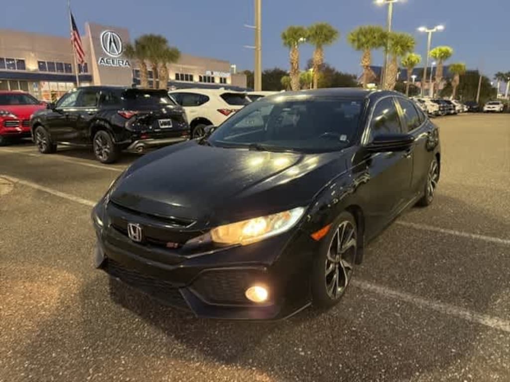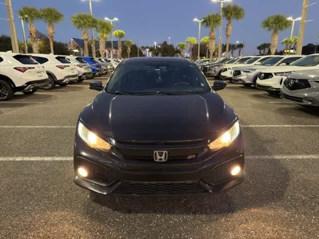 This 2018 Honda Civic Si in Black, features 10 Speakers, 4-Wheel Disc Brakes, ABS brakes, Air Conditioning, Alloy wheels, AM/FM radio: SiriusXM, Apple CarPlay/Android Auto, Automatic temperature control, Brake assist, Bumpers: body-color, Cloth Seat Trim, Compass, Delay-off headlights, Driver door bin, Driver vanity mirror, Dual front impact airbags, Dual front side impact airbags, Electronic Stability Control, Emergency communication system: HondaLink, Exterior Parking Camera Rear, Four wheel independent suspension, Front anti-roll bar, Front Bucket Seats, Front Center Armrest, Front dual zone A/C, Front fog lights, Front reading lights, Fully automatic headlights, Heated door mirrors, Heated front seats, Illuminated entry, Leather Shift Knob, Low tire pressure warning, Occupant sensing airbag, Outside temperature display, Overhead airbag, Panic alarm, Passenger door bin, Passenger vanity mirror, Power door mirrors, Power moonroof, Power steering, Power windows, Radio data system, Radio: 450-Watt AM/FM/HD/SiriusXM Audio System, Rear anti-roll bar, Rear seat center armrest, Rear window defroster, Reclining Heated Front Bucket Seats, Remote keyless entry, Security system, Speed control, Speed-sensing steering, Speed-Sensitive Wipers, Split folding rear seat, Spoiler, Steering wheel mounted audio controls, Tachometer, Telescoping steering wheel, Tilt steering wheel, Traction control, Trip computer, Variably intermittent wipers, and Wheels: 18 Gloss Black Machine-Finished Alloy: