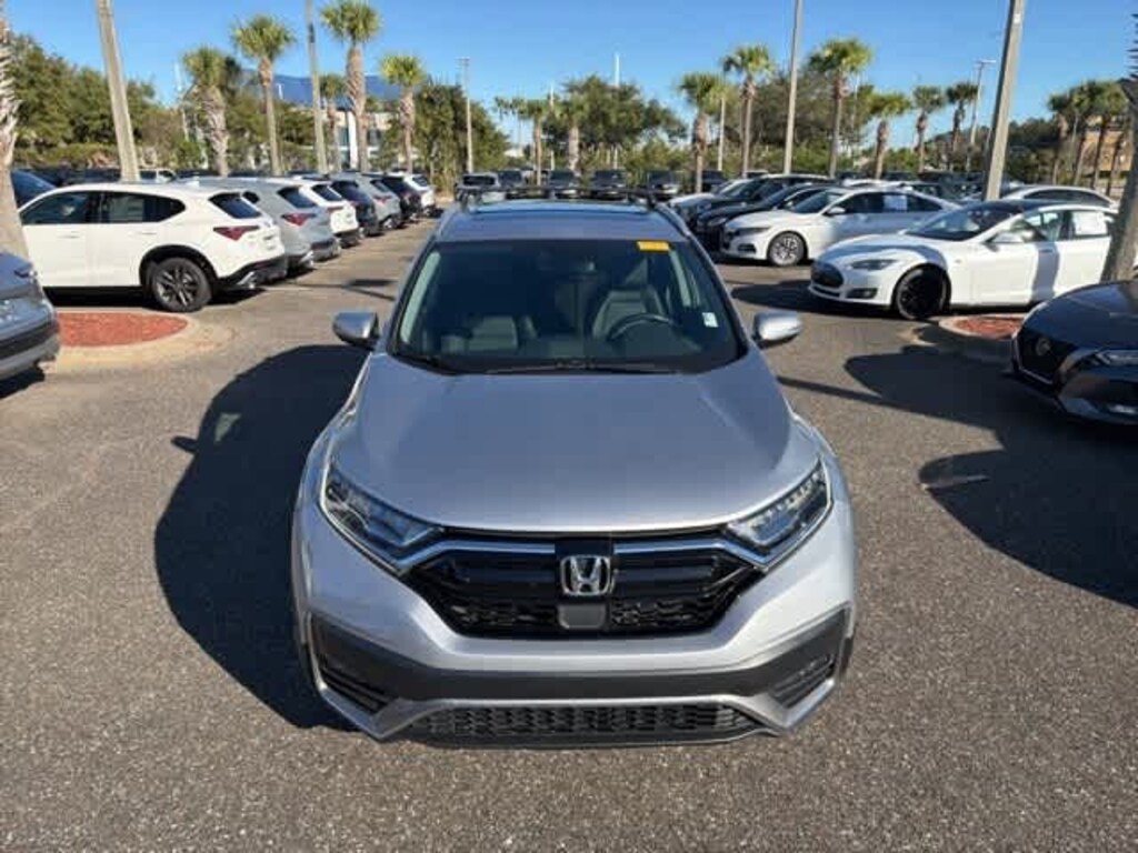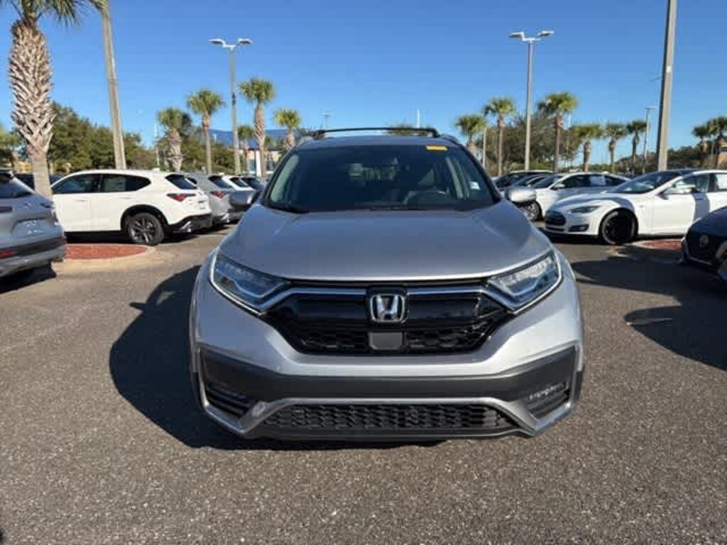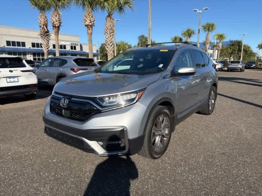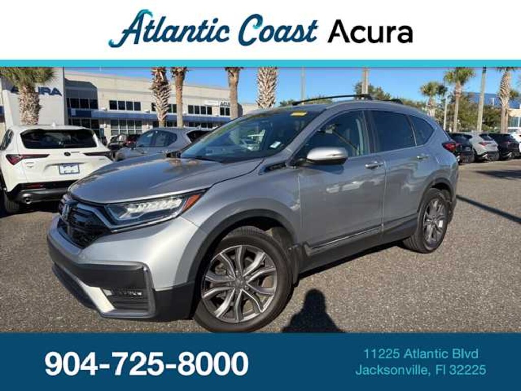 This 2021 Honda CR-V Touring in Silver, features 4-Wheel Disc Brakes, 5.64 Axle Ratio, 9 Speakers, ABS brakes, Adaptive Cruise Control: Adaptive Cruise Control (ACC) with Low-Speed Follow, Air Conditioning, Alloy wheels, AM/FM radio: SiriusXM, Apple CarPlay/Android Auto, Auto High-beam Headlights, Auto-dimming Rear-View mirror, Automatic temperature control, Blind Spot Information (BSI) System warning, Brake assist, Bumpers: body-color, Compass, Delay-off headlights, Driver door bin, Driver vanity mirror, Dual front impact airbags, Dual front side impact airbags, Electronic Stability Control, Exterior Parking Camera Rear, Forward collision: Collision Mitigation Braking System (CMBS) + FCW mitigation, Four wheel independent suspension, Front anti-roll bar, Front Bucket Seats, Front Center Armrest, Front dual zone A/C, Front fog lights, Front reading lights, Garage door transmitter: HomeLink, Heated door mirrors, Heated Front Bucket Seats, Heated front seats, Heated steering wheel, Illuminated entry, Leather Seat Trim, Leather Shift Knob, Low tire pressure warning, Memory seat, Navigation system: Honda Satellite-Linked Navigation System, Occupant sensing airbag, Outside temperature display, Overhead airbag, Overhead console, Panic alarm, Passenger door bin, Passenger vanity mirror, Power door mirrors, Power driver seat, Power Liftgate, Power moonroof, Power passenger seat, Power steering, Power windows, Radio data system, Radio: 330-Watt AM/FM/HD/SiriusXM Prem Audio System, Rain sensing wipers, Rear anti-roll bar, Rear seat center armrest, Rear window defroster, Rear window wiper, Remote keyless entry, Roof rack: rails only, Security system, Speed control, Speed-sensing steering, Speed-Sensitive Wipers, Split folding rear seat, Spoiler, Steering wheel mounted audio controls, Tachometer, Telescoping steering wheel, Tilt steering wheel, Traction control, Trip computer, Turn signal indicator mirrors, Variably intermittent wipers, and Wheels: 19 Machine-Finished Alloy w/Gray Inserts: