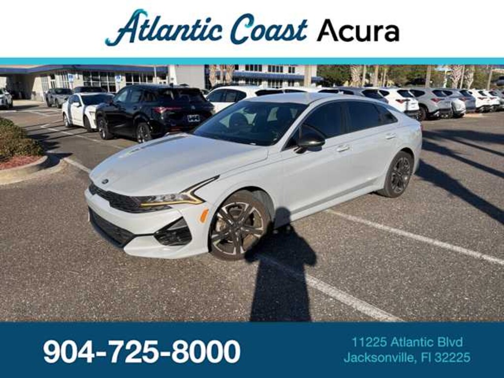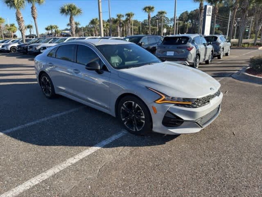 This 2021 Kia K5 GT-Line in Wolf Gray, features 4-Wheel Disc Brakes, 6 Speakers, ABS brakes, Air Conditioning, Alloy wheels, AM/FM radio, Apple CarPlay & Android Auto, Auto High-beam Headlights, Automatic temperature control, Brake assist, Bumpers: body-color, Carpeted Floor Mats, Cloth/Leatherette Seat Trim, Delay-off headlights, Driver door bin, Driver vanity mirror, Dual front impact airbags, Dual front side impact airbags, Electronic Stability Control, Four wheel independent suspension, Front anti-roll bar, Front Bucket Seats, Front Center Armrest, Front dual zone A/C, Front fog lights, Front reading lights, Fully automatic headlights, Heated door mirrors, Illuminated entry, Knee airbag, Low tire pressure warning, Occupant sensing airbag, Outside temperature display, Overhead airbag, Overhead console, Panic alarm, Passenger door bin, Passenger vanity mirror, Power door mirrors, Power driver seat, Power steering, Power windows, Radio data system, Radio: AM/FM/MP3 Audio System, Rear anti-roll bar, Rear seat center armrest, Rear side impact airbag, Rear window defroster, Remote keyless entry, Security system, Speed control, Speed-sensing steering, Split folding rear seat, Spoiler, Sport steering wheel, Steering wheel mounted audio controls, Tachometer, Telescoping steering wheel, Tilt steering wheel, Traction control, Trip computer, Turn signal indicator mirrors, Variably intermittent wipers, and Wheels: 7.5J x 18 Graphite Machined Finish Alloy: