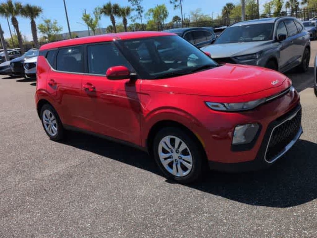 This 2022 Kia Soul LX in Inferno Red, features 16 x 6.5 Alloy Wheels, 16 x 6.5 Steel Wheels, 4-Wheel Disc Brakes, 6 Speakers, ABS brakes, Air Conditioning, AM/FM radio, Apple CarPlay & Android Auto, Brake assist, Bumpers: body-color, Carpeted Floor Mats, Delay-off headlights, Driver door bin, Driver vanity mirror, Dual front impact airbags, Dual front side impact airbags, Electronic Stability Control, Exterior Parking Camera Rear, Front anti-roll bar, Front Bucket Seats, Front Center Armrest, Front reading lights, Front wheel independent suspension, Fully automatic headlights, Illuminated entry, Low tire pressure warning, Occupant sensing airbag, Outside temperature display, Overhead airbag, Overhead console, Panic alarm, Passenger door bin, Passenger vanity mirror, Power door mirrors, Power steering, Power windows, Radio: AM/FM/MP3 Audio System, Rear window defroster, Rear window wiper, Remote keyless entry, Speed control, Speed-sensing steering, Split folding rear seat, Steering wheel mounted audio controls, Tachometer, Telescoping steering wheel, Tilt steering wheel, Traction control, Trip computer, Variably intermittent wipers, and Woven & Tricot Cloth Seat Trim: