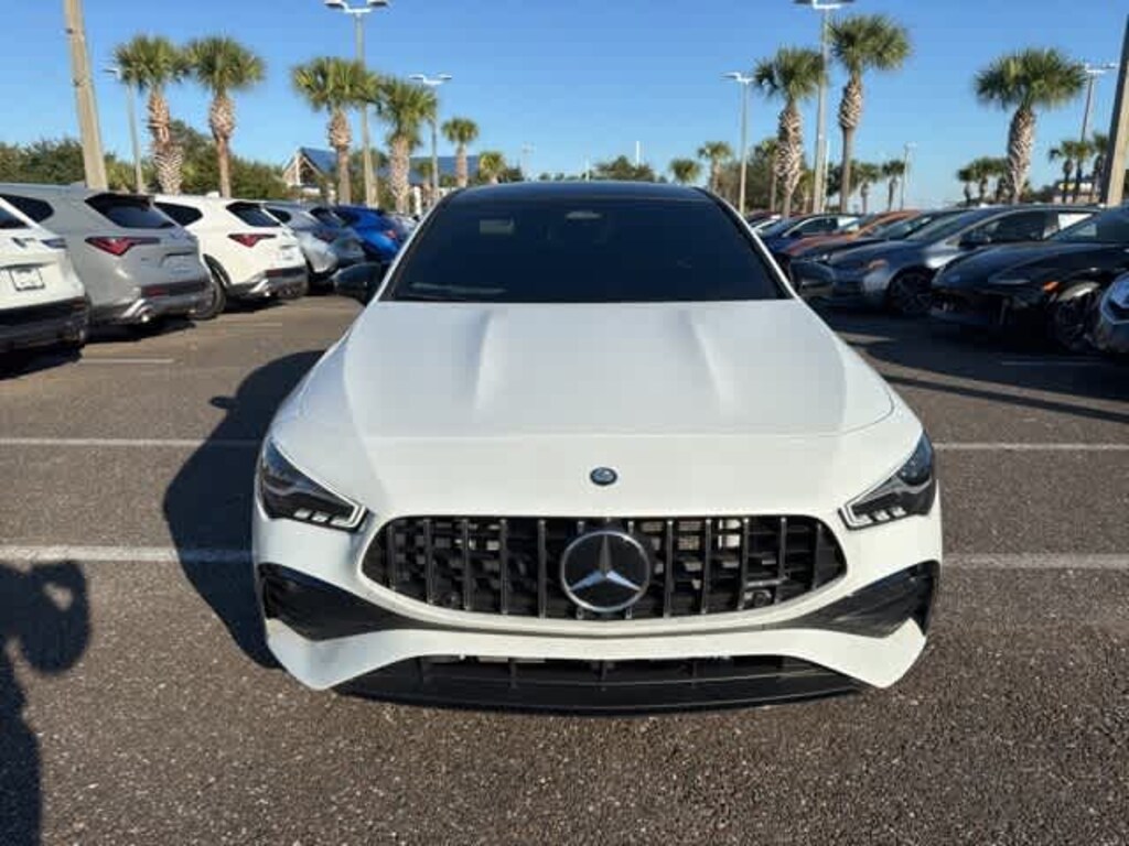 This 2024 Mercedes-Benz CLA CLA 35 AMGî in Digital White Metallic, features 12 Speakers, 4-Wheel Disc Brakes, 8-Way Power Front Seats w/3-Position Memory, ABS brakes, Air Conditioning, Alloy wheels, AM/FM radio: SiriusXM, Apple CarPlayî/Android Autoî, Auto High-beam Headlights, Automatic temperature control, Brake assist, Brushed Aluminum Trim, Bumpers: body-color, Burmesterî Surround Sound System w/Dolby Atmos, Child-Seat-Sensing Airbag, Delay-off headlights, Driver door bin, Driver vanity mirror, Dual front impact airbags, Dual front side impact airbags, Electronic Stability Control, Emergency communication system: eCall Emergency System, Exterior Parking Camera Rear, Four wheel independent suspension, Front anti-roll bar, Front Bucket Seats, Front Center Armrest, Front dual zone A/C, Front reading lights, Fully automatic headlights, Garage door transmitter, Heated door mirrors, Heated front seats, Illuminated entry, Knee airbag, Leather steering wheel, Low tire pressure warning, MB-Tex/Microfiber Upholstery, Memory seat, Occupant sensing airbag, Outside temperature display, Overhead airbag, Overhead console, Panic alarm, Passenger door bin, Passenger vanity mirror, Power door mirrors, Power driver seat, Power moonroof, Power passenger seat, Power steering, Power windows, Radio data system, Radio: MBUX Multimedia System w/10.25 Touchscreen, Rain sensing wipers, Rear anti-roll bar, Rear fog lights, Rear reading lights, Rear seat center armrest, Rear window defroster, Remote keyless entry, Security system, SiriusXM Radio, Smartphone Integration, Speed control, Speed-sensing steering, Split folding rear seat, Spoiler, Sport steering wheel, Steering wheel mounted audio controls, Tachometer, Telescoping steering wheel, Tilt steering wheel, Traction control, Trip computer, Turn signal indicator mirrors, Variably intermittent wipers, and Wheels: 18 AMGî 10-Spoke: