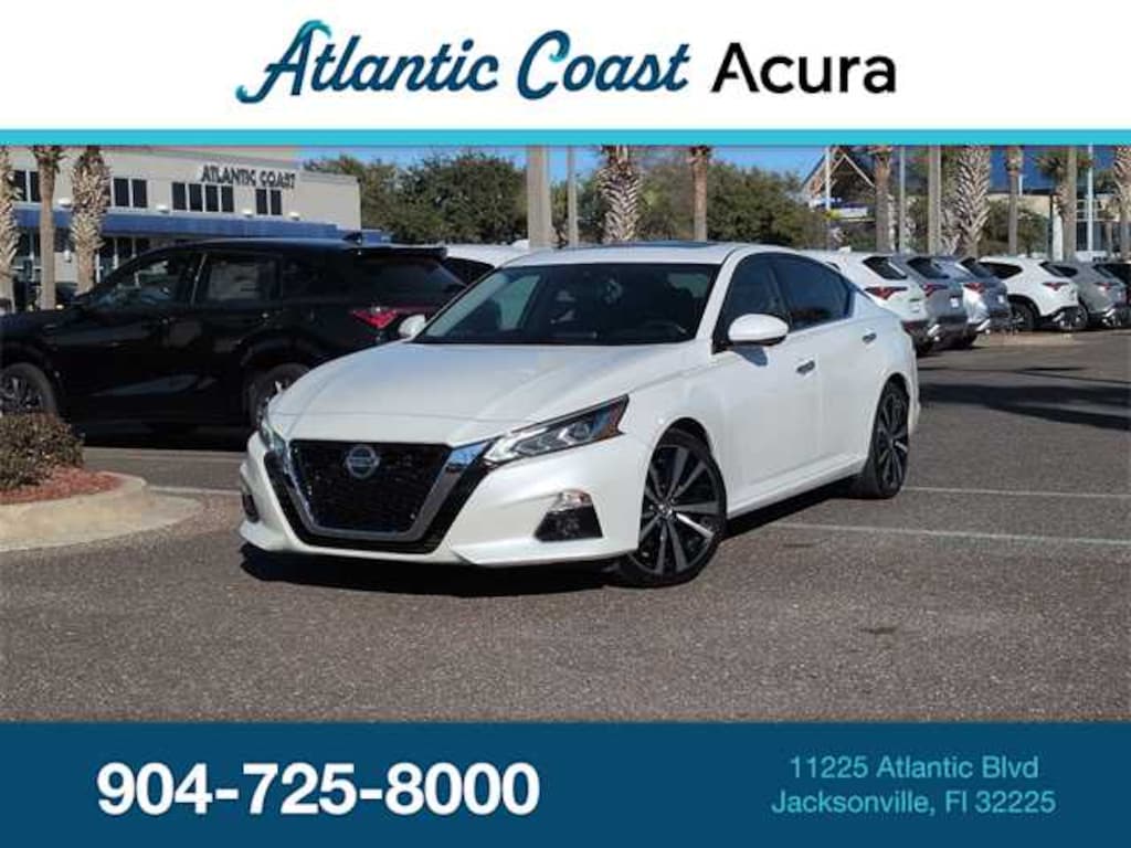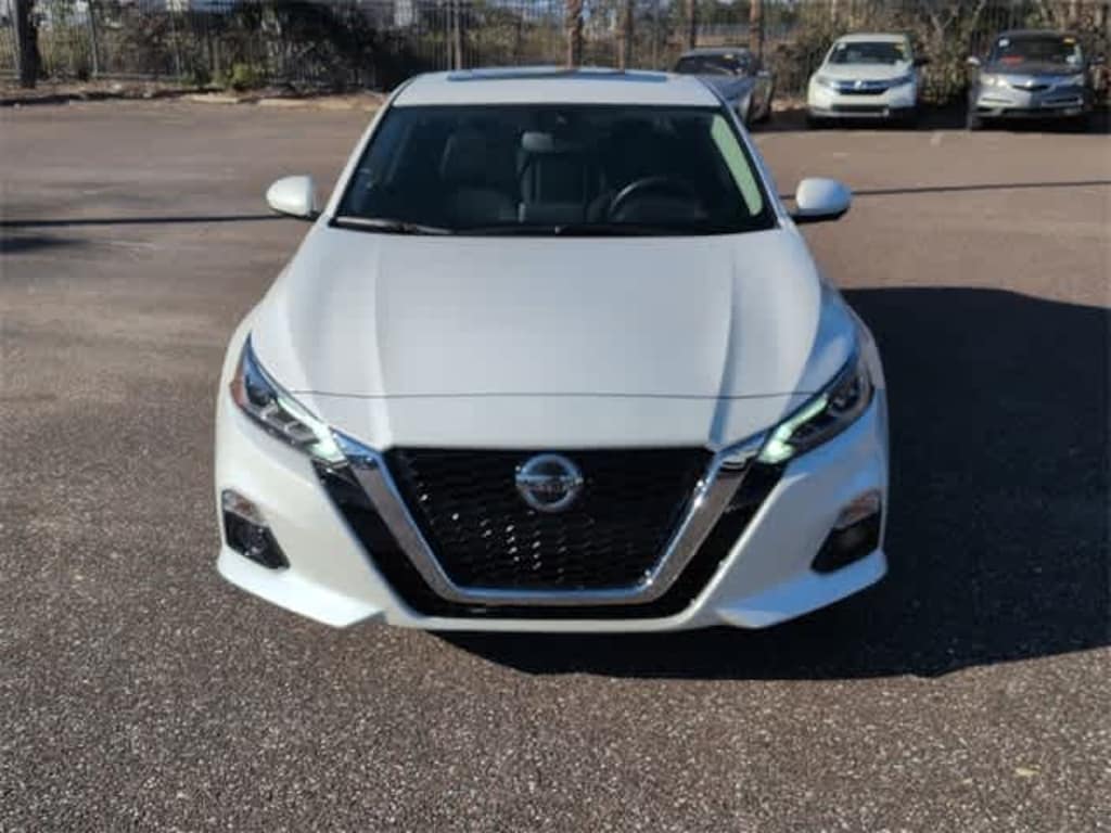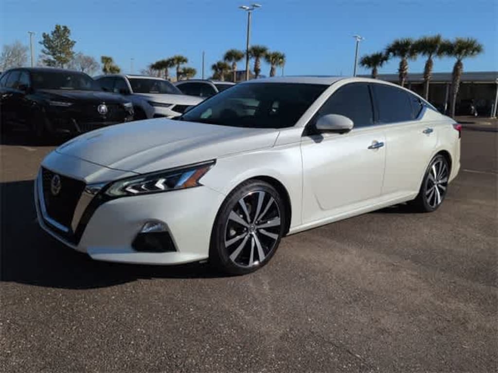 This 2019 Nissan Altima 2.5 Platinum in Pearl White Tricoat, features 19 Alloy Wheels, 4-Wheel Disc Brakes, 9 Speakers, ABS brakes, Air Conditioning, Alloy wheels, AM/FM radio: SiriusXM, Auto High-beam Headlights, Auto-dimming Rear-View mirror, Automatic temperature control, Blind Spot Warning, Brake assist, Bumpers: body-color, Compass, Delay-off headlights, Driver door bin, Driver vanity mirror, Dual front impact airbags, Dual front side impact airbags, Electronic Stability Control, Emergency communication system: NissanConnect Services, Four wheel independent suspension, Front anti-roll bar, Front Bucket Seats, Front Center Armrest w/Storage, Front dual zone A/C, Front fog lights, Front reading lights, Fully automatic headlights, Garage door transmitter: HomeLink, Heated door mirrors, Heated Front Bucket Seats, Heated front seats, Heated steering wheel, Illuminated entry, Knee airbag, Leather Shift Knob, Leather-Appointed Seat Trim, Low tire pressure warning, Memory seat, Navigation System, NissanConnect featuring Apple CarPlay and Android Auto, Occupant sensing airbag, Outside temperature display, Overhead airbag, Overhead console, Panic alarm, Passenger door bin, Passenger vanity mirror, Power door mirrors, Power driver seat, Power passenger seat, Power steering, Power windows, Radio data system, Radio: AM/FM/HD w/Bose Premium Sound System, Rear anti-roll bar, Rear reading lights, Rear seat center armrest, Rear side impact airbag, Rear window defroster, Remote keyless entry, Security system, Speed control, Speed-sensing steering, Split folding rear seat, Steering wheel mounted audio controls, Tachometer, Telescoping steering wheel, Tilt steering wheel, Traction control, Trip computer, Turn signal indicator mirrors, and Variably intermittent wipers: