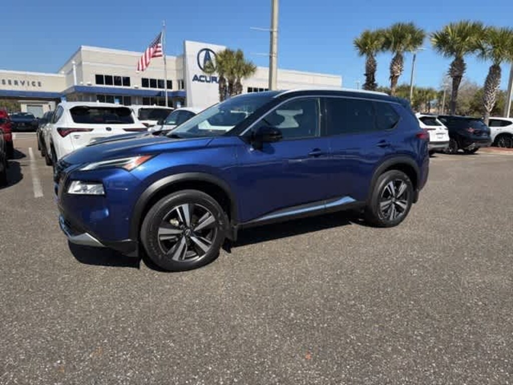 This 2023 Nissan Rogue Platinum in Caspian Blue Metallic/Super Black, features Platinum Premium Package (Heads-Up Display, Rear Heated Seats, and Tri-Zone HVAC), 10 Speakers, 19 Aluminum Alloy Wheels, 4-Wheel Disc Brakes, 5.604 Axle Ratio, ABS brakes, Air Conditioning, Alloy wheels, AM/FM radio: SiriusXM, Auto High-beam Headlights, Auto-dimming Rear-View mirror, Automatic temperature control, Black Splash Guards (Set of 4), Bose Premium Audio System, Brake assist, Bumpers: body-color, Chrome Rear Bumper Protector, Delay-off headlights, Driver door bin, Driver vanity mirror, Dual front impact airbags, Dual front side impact airbags, Electronic Stability Control, Emergency communication system: NissanConnect Services, First Aid Kit, Floor Mats w/2-Piece Cargo Area Protector, Four wheel independent suspension, Frameless Rearview Mirror w/Universal Remote, Front anti-roll bar, Front Bucket Seats, Front Center Armrest, Front dual zone A/C, Front reading lights, Fully automatic headlights, Heated door mirrors, Heated Front Bucket Seats, Heated front seats, Heated steering wheel, Illuminated entry, Illuminated Kick Plates, Knee airbag, Leather steering wheel, Low tire pressure warning, Memory seat, Navigation system: NissanConnect Navigation, NissanConnect featuring Apple CarPlay and Android Auto, Occupant sensing airbag, Outside temperature display, Overhead airbag, Overhead console, Panic alarm, Passenger door bin, Passenger vanity mirror, Power door mirrors, Power driver seat, Power Liftgate, Power moonroof, Power passenger seat, Power steering, Power windows, Quilted Semi-Aniline Leather Seat Trim, Radio data system, Radio: AM/FM NissanConnect w/Navigation, Rear anti-roll bar, Rear reading lights, Rear seat center armrest, Rear side impact airbag, Rear window defroster, Rear window wiper, Remote keyless entry, Security system, Speed control, Speed-Sensitive Wipers, Split folding rear seat, Spoiler, Steering wheel mounted audio controls, Tachometer, Telescoping steering wheel, Tilt steering wheel, Traction control, Trip computer, Turn signal indicator mirrors, USB Charging Cable Set - Nissan, and Variably intermittent wipers: