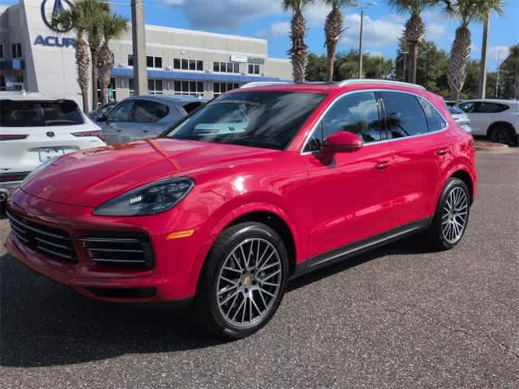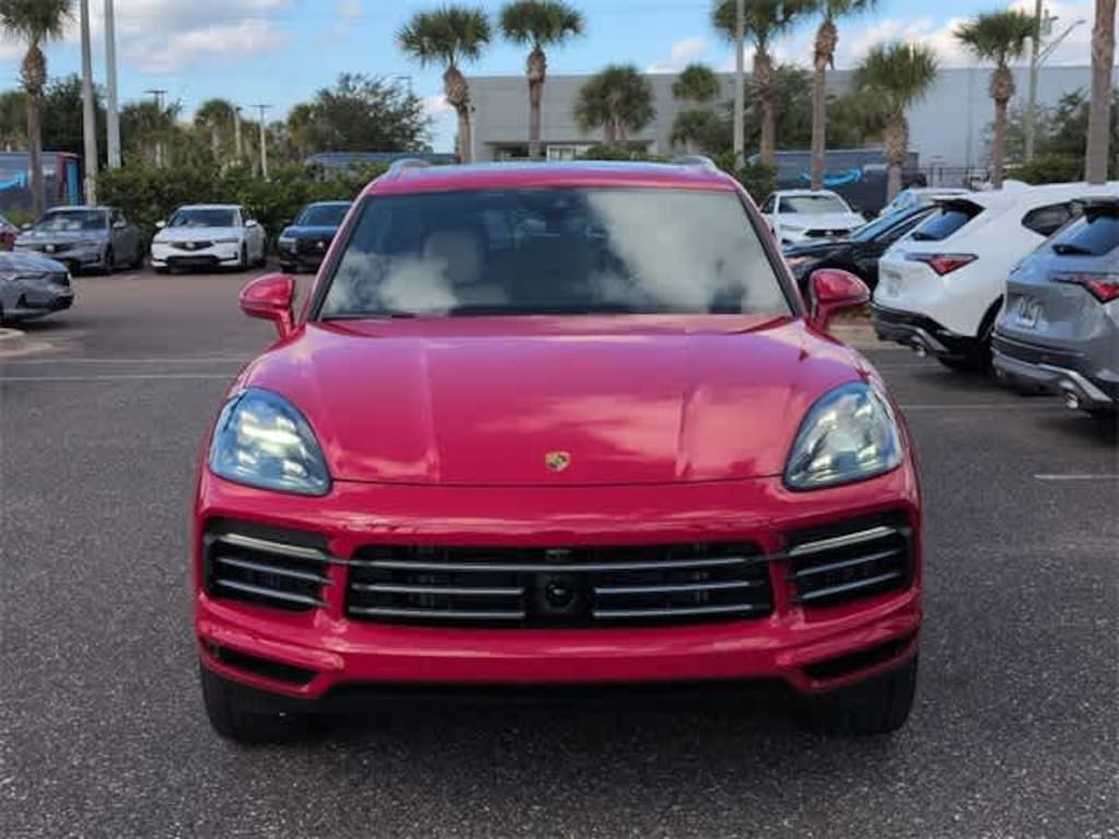 This 2022 Porsche Cayenne in Red, features ABS brakes, Alloy wheels, Electronic Stability Control, Front dual zone A/C, Heated door mirrors, Illuminated entry, Leather Seat Trim, Low tire pressure warning, Navigation System, Porsche Communication Management, Power Liftgate, Remote keyless entry, Traction control, 10 Speakers, 4-Wheel Disc Brakes, 8-Way Power Seats, Adaptive suspension, Air Conditioning, AM/FM radio: SiriusXM, Apple CarPlay, Automatic temperature control, Axle Ratio: 3.480, Brake assist, Bumpers: body-color, Delay-off headlights, Driver door bin, Driver vanity mirror, Dual front impact airbags, Dual front side impact airbags, Exterior Parking Camera Rear, Four wheel independent suspension, Front anti-roll bar, Front Bucket Seats, Front Center Armrest, Front reading lights, Fully automatic headlights, Garage door transmitter: HomeLink, Knee airbag, Leather Shift Knob, Occupant sensing airbag, Outside temperature display, Overhead airbag, Overhead console, Panic alarm, Passenger door bin, Passenger vanity mirror, Power door mirrors, Power driver seat, Power passenger seat, Power steering, Power windows, Radio data system, Rain sensing wipers, Rear anti-roll bar, Rear fog lights, Rear reading lights, Rear seat center armrest, Rear side impact airbag, Rear window defroster, Rear window wiper, Security system, Speed control, Split folding rear seat, Spoiler, Steering wheel mounted audio controls, Tachometer, Telescoping steering wheel, Tilt steering wheel, Trip computer, Turn signal indicator mirrors, Variably intermittent wipers, Voltmeter, and Wheels: 19 Cayenne: