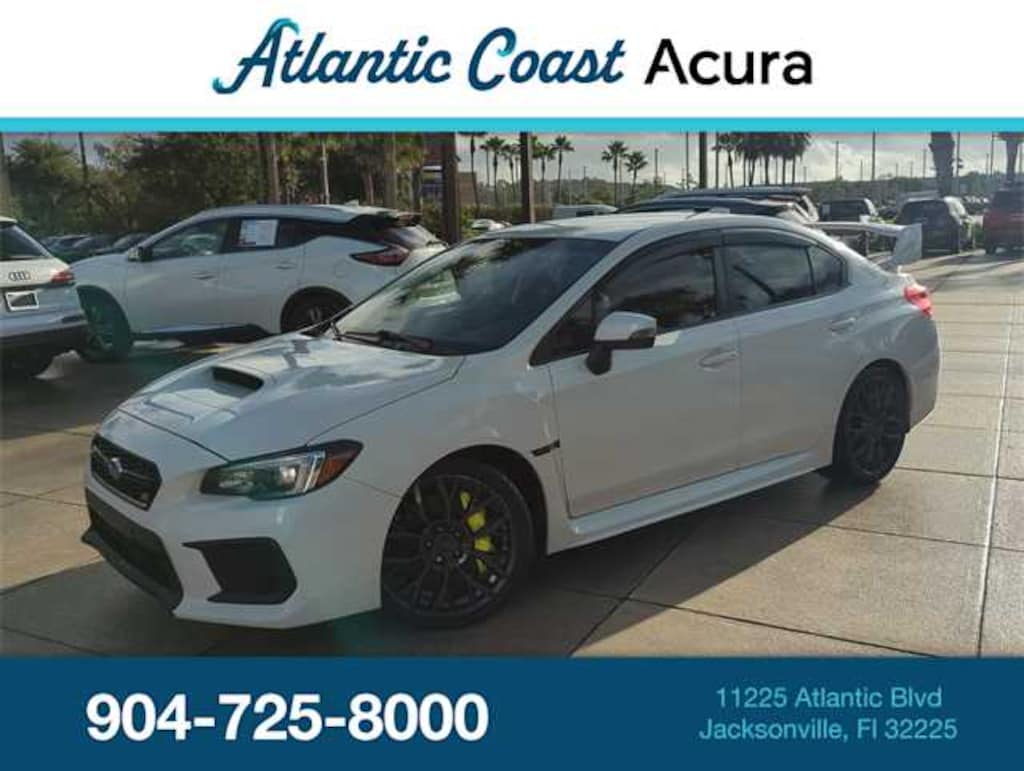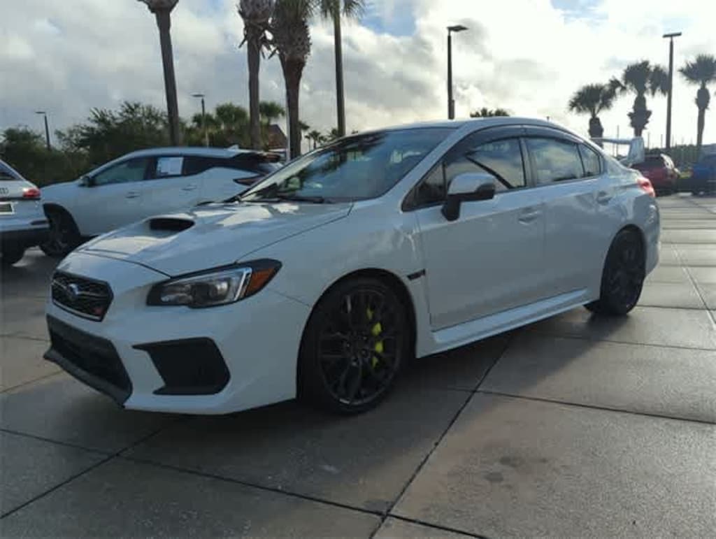 This 2019 Subaru WRX STi in Crystal White Pearl, features Popular Package #3 (IZT) (All-Weather Floor Liners, Alloy Wheel Locks, Auto-Dimming Mirror w/Compass & HomeLink, Cargo Tray, LED Upgrade - Map & Dome Lights, and Rear Bumper Applique), Standard Model, 19 Alloy Wheels, 4-Wheel Disc Brakes, 6 Speakers, ABS brakes, Air Conditioning, Alcantara Ultrasuede Upholstery, Alloy wheels, AM/FM radio: SiriusXM, Automatic temperature control, Brake assist, Bumpers: body-color, CD player, Center Armrest Extension - Black, Delay-off headlights, Driver door bin, Driver vanity mirror, Dual front impact airbags, Dual front side impact airbags, Electronic Stability Control, Exterior Parking Camera Rear, Four wheel independent suspension, Front anti-roll bar, Front Bucket Seats, Front Center Armrest, Front dual zone A/C, Front fog lights, Front reading lights, Fully automatic headlights, Heated door mirrors, Heated front seats, Illuminated entry, Knee airbag, Leather Shift Knob, Leather steering wheel, Low tire pressure warning, Occupant sensing airbag, Outside temperature display, Overhead airbag, Panic alarm, Passenger door bin, Passenger vanity mirror, Performance Design Heated Front Bucket Seats, Power door mirrors, Power steering, Power windows, Radio data system, Radio: Subaru STARLINK 7.0 Multimedia Plus System, Rear anti-roll bar, Rear seat center armrest, Rear window defroster, Remote keyless entry, Security system, Speed control, Speed-sensing steering, Split folding rear seat, Spoiler, Sport steering wheel, STARLINK/Apple CarPlay/Android Auto, Steering wheel mounted audio controls, STI Short Throw Shifter (STI), Tachometer, Telescoping steering wheel, Tilt steering wheel, Traction control, Trip computer, Turn signal indicator mirrors, Variably intermittent wipers, and Vortex Generator: