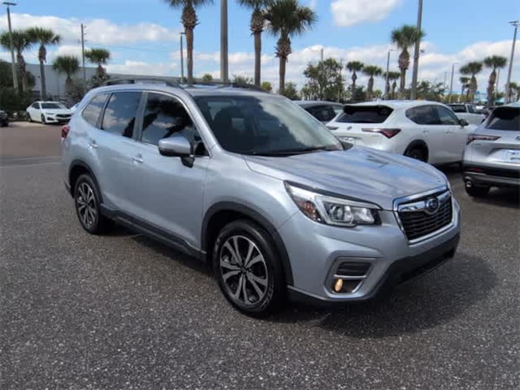 This 2020 Subaru Forester Limited in Ice Silver Metallic, features Audio Sys & Driver Assist Tech & Htd Steer Wheel (harman kardon 576W Amp & Speaker System, Heated Steering Wheel, Radio: Subaru Starlink 8.0 Multimedia Nav System, and Reverse Automatic Braking System (RAB)), 3.70 Axle Ratio, 4-Wheel Disc Brakes, 6 Speakers, ABS brakes, Aero Crossbar Set, Air Conditioning, All-Weather Floor Liners, Alloy wheels, AM/FM radio: SiriusXM, Auto High-beam Headlights, Auto-Dimming Mirror w/Compass & HomeLink, Automatic temperature control, Brake assist, Bumpers: body-color, Cargo Net, CD player, Dome Light LED Upgrade, Door Scuff Protector, Driver door bin, Driver vanity mirror, Dual front impact airbags, Dual front side impact airbags, Electronic Stability Control, Emergency communication system: STARLINK Safety and Security (Subscription Required), Exterior Parking Camera Rear, Four wheel independent suspension, Front anti-roll bar, Front Bucket Seats, Front Center Armrest, Front dual zone A/C, Front fog lights, Front reading lights, Fully automatic headlights, Heated door mirrors, Heated Front Bucket Seats, Heated front seats, Illuminated entry, Knee airbag, Leather Shift Knob, Low tire pressure warning, Navigation System, Occupant sensing airbag, Outside temperature display, Overhead airbag, Overhead console, Panic alarm, Passenger door bin, Passenger vanity mirror, Perforated Leather-Trimmed Upholstery, Power door mirrors, Power driver seat, Power Liftgate, Power moonroof: Panoramic, Power steering, Power windows, Radio data system, Radio: Subaru Starlink 8.0 Multimedia Plus System, Rear anti-roll bar, Rear Bumper Cover, Rear seat center armrest, Rear window defroster, Rear window wiper, Remote keyless entry, Roof rack: rails only, Security system, Speed control, Speed-sensing steering, Split folding rear seat, Spoiler, STARLINK/Apple CarPlay/Android Auto, Steering wheel mounted audio controls, Sunshade, Tachometer, Telescoping steering wheel, Tilt steering wheel, Traction control, Trip computer, Turn signal indicator mirrors, Variably intermittent wipers, and Wheels: 18 x 7.0J Black Machine Finish Alum Alloy: