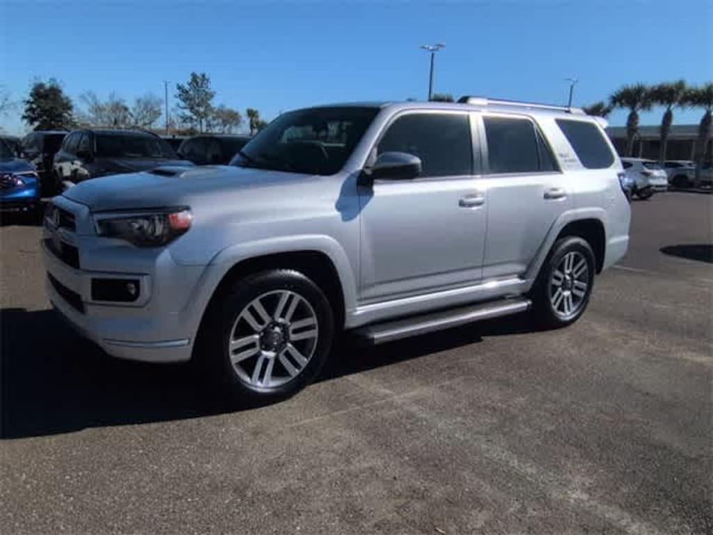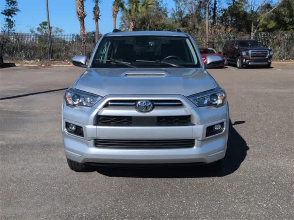 This 2022 Toyota 4Runner TRD Sport in Classic Silver Metallic, features 3.727 Axle Ratio, 4-Wheel Disc Brakes, 8 Speakers, ABS brakes, Air Conditioning, Alloy wheels, AM/FM radio: SiriusXM, Anti-whiplash front head restraints, Apple CarPlay/Android Auto, Auto High-beam Headlights, Black Roof Rails, Brake assist, Bumpers: body-color, Driver door bin, Driver vanity mirror, Dual front impact airbags, Dual front side impact airbags, Electronic Stability Control, Emergency communication system: Safety Connect with 1-year trial, Exterior Parking Camera Rear, Front anti-roll bar, Front Bucket Seats, Front Center Armrest, Front fog lights, Front reading lights, Front wheel independent suspension, Heated door mirrors, Illuminated entry, Knee airbag, Leather Shift Knob, Leather steering wheel, Low tire pressure warning, Occupant sensing airbag, Outside temperature display, Overhead airbag, Overhead console, Panic alarm, Passenger door bin, Passenger vanity mirror, Power door mirrors, Power driver seat, Power steering, Power windows, Radio: Audio, Rear anti-roll bar, Rear seat center armrest, Rear window defroster, Rear window wiper, Remote keyless entry, Roof rack: rails only, Security system, Shift Knob, SofTex Seat Trim, Speed control, Speed-sensing steering, Split folding rear seat, Spoiler, Steering wheel mounted audio controls, Tachometer, Telescoping steering wheel, Tilt steering wheel, Traction control, TRD Sport Badge, TRD Sport Carpet Floor Mats, Trip computer, Variably intermittent wipers, and Wheels: 20 Dark Gray Metallic Machined-Face Alloy: