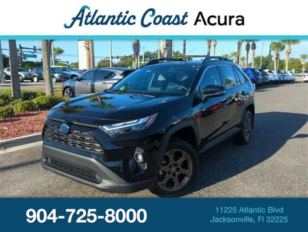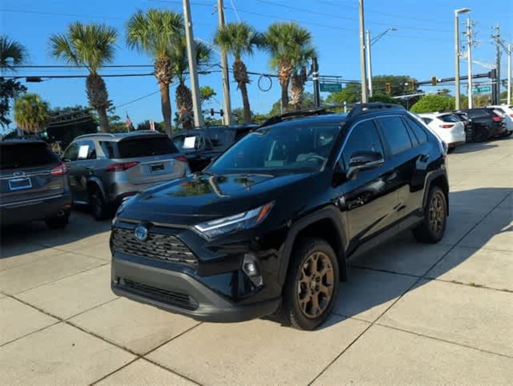 This 2024 Toyota RAV4 Hybrid Woodland Edition in Midnight Black Metallic, features Weather Package (Front Seat Heating and Heated 3-Spoke Leather Steering Wheel), Woodland Edition, 18 x 7.0J Alloy Wheels, 4-Wheel Disc Brakes, 6 Speakers, ABS brakes, Air Conditioning, Alloy wheels, AM/FM radio: SiriusXM, Auto High-beam Headlights, Automatic temperature control, Axle Ratio: TBD, Brake assist, Bumpers: body-color, Delay-off headlights, Driver door bin, Driver vanity mirror, Dual front impact airbags, Dual front side impact airbags, Electronic Stability Control, Emergency communication system: Safety Connect (1-year trial), Exterior Parking Camera Rear, Fabric Seat Trim, Four wheel independent suspension, Front anti-roll bar, Front Bucket Seats, Front Center Armrest, Front dual zone A/C, Front fog lights, Front reading lights, Fully automatic headlights, Heated door mirrors, Illuminated entry, Knee airbag, Low tire pressure warning, Occupant sensing airbag, Outside temperature display, Overhead airbag, Overhead console, Panic alarm, Passenger door bin, Passenger vanity mirror, Power door mirrors, Power driver seat, Power steering, Power windows, Radio data system, Radio: AM/FM/XM Audio System, Rear anti-roll bar, Rear seat center armrest, Rear window defroster, Rear window wiper, Remote keyless entry, Roof rack, Speed control, Speed-sensing steering, Split folding rear seat, Spoiler, Steering wheel mounted audio controls, Telescoping steering wheel, Tilt steering wheel, Traction control, Trip computer, Turn signal indicator mirrors, and Variably intermittent wipers: