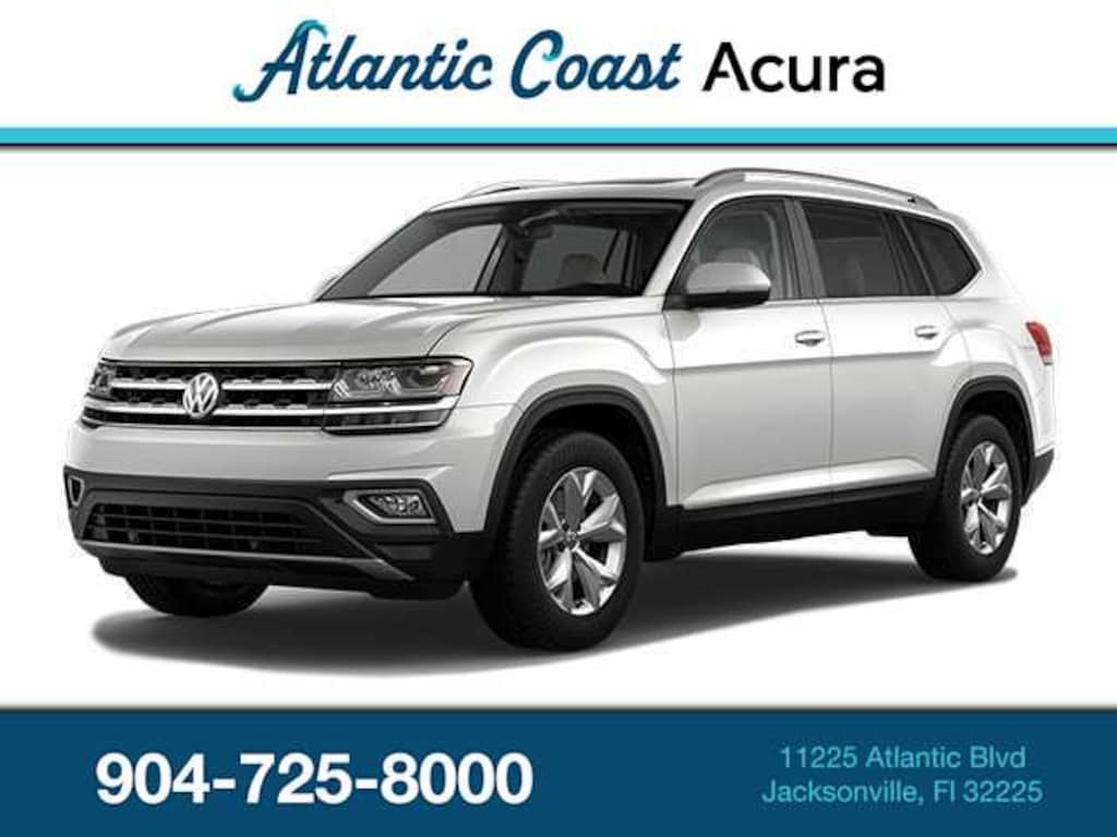 This 2019 Volkswagen Atlas SEL in White, features 18 5-Spoke Wheels, 3.60 Axle Ratio, 3rd row seats: split-bench, 4-Wheel Disc Brakes, 8 Speakers, ABS brakes, Active Blind Spot Monitor, Air Conditioning, Alloy wheels, AM/FM radio: SiriusXM, Auto-dimming Rear-View mirror, Automatic temperature control, Brake assist, Bumpers: body-color, Compass, Delay-off headlights, Driver door bin, Driver vanity mirror, Dual front impact airbags, Dual front side impact airbags, Electronic Stability Control, Emergency communication system: VW Car-Net services (capabilities require enrollment or subscription), Exterior Parking Camera Rear, Forward collision: FCW w/Autonomous Emergency Braking mitigation, Four wheel independent suspension, Front anti-roll bar, Front Bucket Seats, Front Center Armrest, Front dual zone A/C, Front fog lights, Front reading lights, Garage door transmitter: HomeLink, Heated Comfort Front Bucket Seats, Heated door mirrors, Heated front seats, Heated steering wheel, Illuminated entry, Low tire pressure warning, Memory seat, Navigation System, Occupant sensing airbag, Outside temperature display, Overhead airbag, Overhead console, Panic alarm, Passenger door bin, Passenger vanity mirror, Power door mirrors, Power driver seat, Power Liftgate, Power moonroof, Power passenger seat, Power steering, Power windows, Radio data system, Radio: Discover Media 8.0 Touchscreen w/Nav, Rain sensing wipers, Rear air conditioning, Rear anti-roll bar, Rear reading lights, Rear seat center armrest, Rear window defroster, Rear window wiper, Remote CD player, Remote keyless entry, Roof rack: rails only, Security system, Speed control, Speed-sensing steering, Split folding rear seat, Spoiler, Standard Suspension, Steering wheel mounted audio controls, Tachometer, Telescoping steering wheel, Tilt steering wheel, Traction control, Trip computer, Turn signal indicator mirrors, V-Tex Leatherette Seating Surfaces, and Variably intermittent wipers: