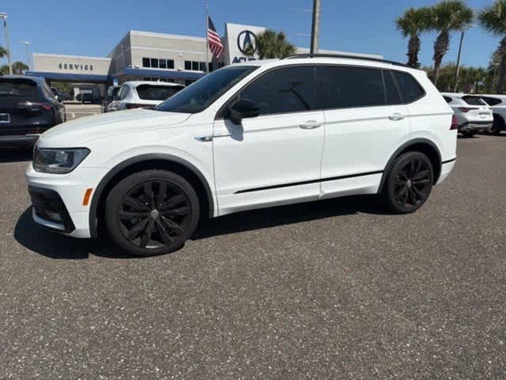 This 2020 Volkswagen Tiguan 2.0T SE R-Line Black in Pure White, features 3-Row Rubber Monster Mats w/Logo Kit (Set of 5), 3.33 Axle Ratio, 3rd row seats: bench, 4-Wheel Disc Brakes, 4-Wheel Independent Suspension, 6 Speakers, ABS brakes, Air Conditioning, Alloy wheels, AM/FM radio: SiriusXM, Automatic temperature control, Brake assist, Bumpers: body-color, Cargo Area Retractable Privacy Cover, Compass, Delay-off headlights, Driver door bin, Driver vanity mirror, Dual front impact airbags, Dual front side impact airbags, Electronic Stability Control, Emergency communication system: VW Car-Net services (capabilities require enrollment or subscription), Exterior Parking Camera Rear, First Aid Kit, Forward collision: FCW w/Autonomous Emergency Braking mitigation, Four wheel independent suspension, Front anti-roll bar, Front Bucket Seats, Front Center Armrest, Front dual zone A/C, Front fog lights, Front reading lights, Fully automatic headlights, Heated door mirrors, Heated Front Comfort Seats, Heated front seats, Heavy Duty Trunk Liner w/VW CarGo Blocks, Illuminated entry, Leather Shift Knob, Low tire pressure warning, Occupant sensing airbag, Outside temperature display, Overhead airbag, Overhead console, Panic alarm, Passenger door bin, Passenger vanity mirror, Perforated V-Tex Leatherette Seating Surfaces, Power door mirrors, Power driver seat, Power moonroof, Power steering, Power windows, Radio data system, Radio: Composition Media AM/FM/HD, Rear anti-roll bar, Rear reading lights, Rear seat center armrest, Rear window defroster, Rear window wiper, Remote keyless entry, Roadside Assistance Kit, Roof rack: rails only, Security system, Speed control, Speed-sensing steering, Split folding rear seat, Spoiler, Steering wheel mounted audio controls, Tachometer, Telescoping steering wheel, Tilt steering wheel, Traction control, Trip computer, Turn signal indicator mirrors, Variably intermittent wipers, VW App-Connect (w/Apple CarPlay, Android Auto & MirrorLink), and Wheels: 20 Machined Black Alloy: